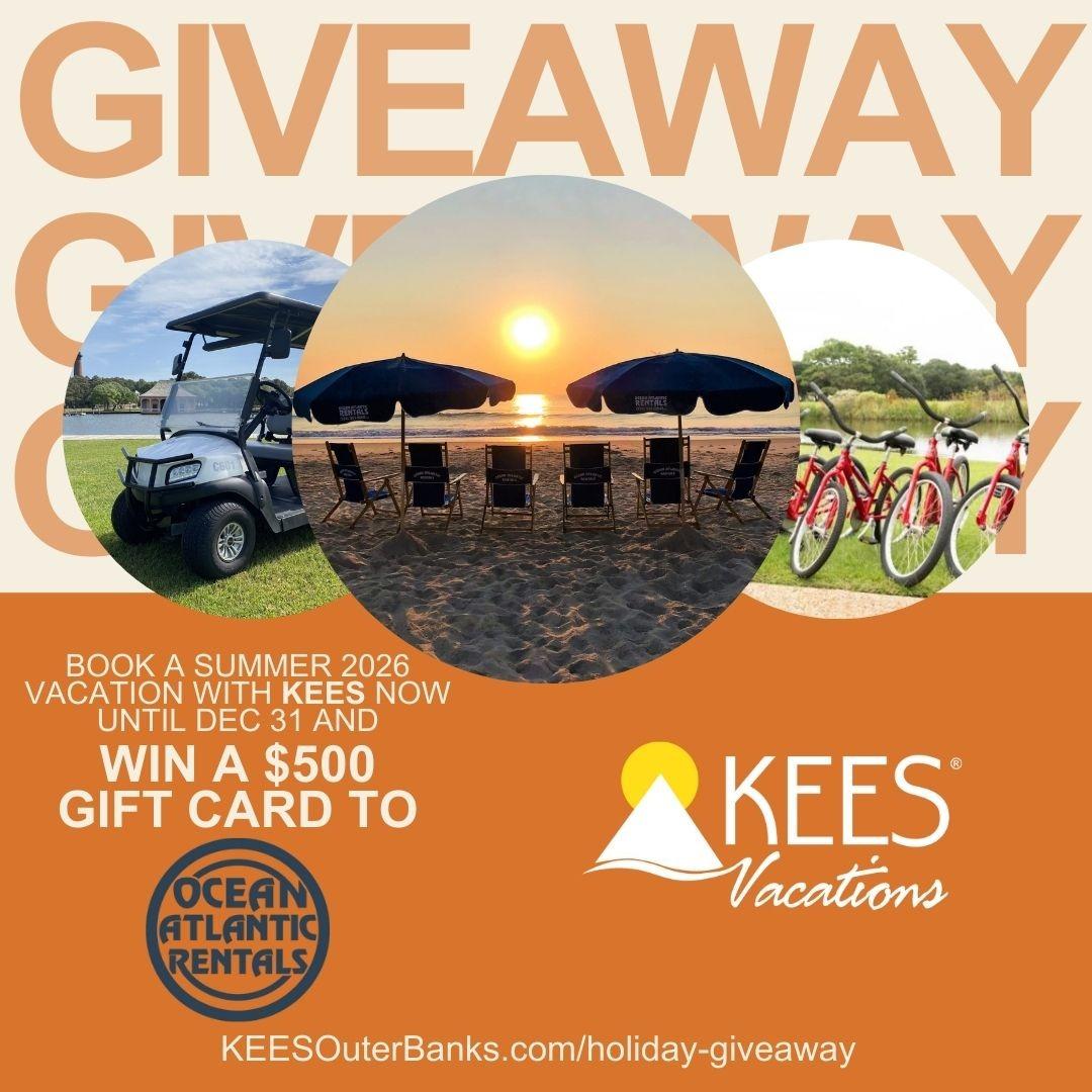 HOLIDAY GIVEAWAY! We are giving away two $500 Ocean Atlantic Rentals gift cards to guests who book a 2026 KEES Vacations stay between December 12 - 30, 2025 (by midnight EST) for arrival between May and September 2026. Two winners will be selected and announced on December 31 at 1 PM EST. They will receive a coupon code to use directly on the Ocean Atlantic Rentals website. The credit must be used in 2026 and cannot be resold. Direct bookings only (Website, phone, email, text). Found on the specials page.