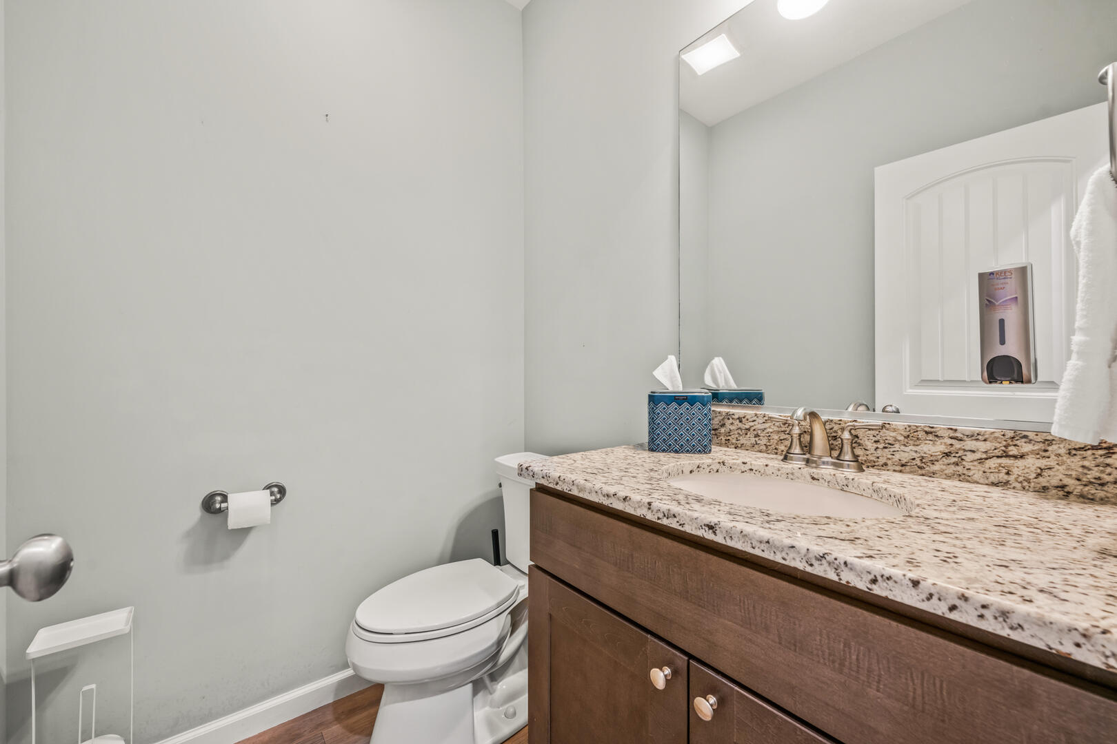 When you step inside the first level of the home, you will feel at ease in the spacious living room. This home has an open-concept design, and the gourmet kitchen has plenty of cooking space, granite countertops, stainless steel appliances, and an island. Just down the hall, you will find a cozy half-bathroom.