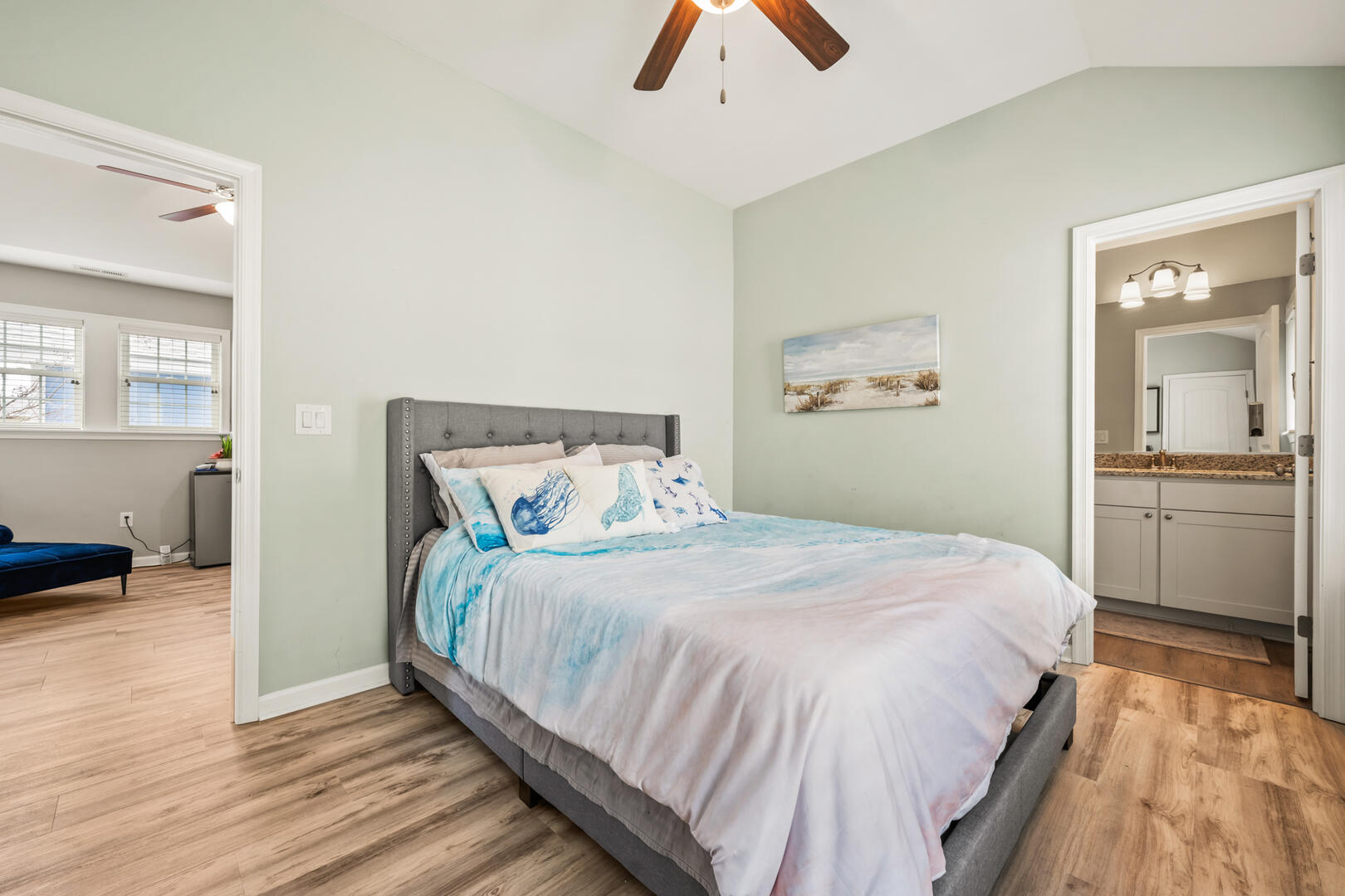 Walk upstairs and you will find a casual sitting area just at the top of the stairs. The second level of the home features three En Suites. A large, comfortable, King En Suite with high ceilings and private balcony access, a two Queen En Suites.