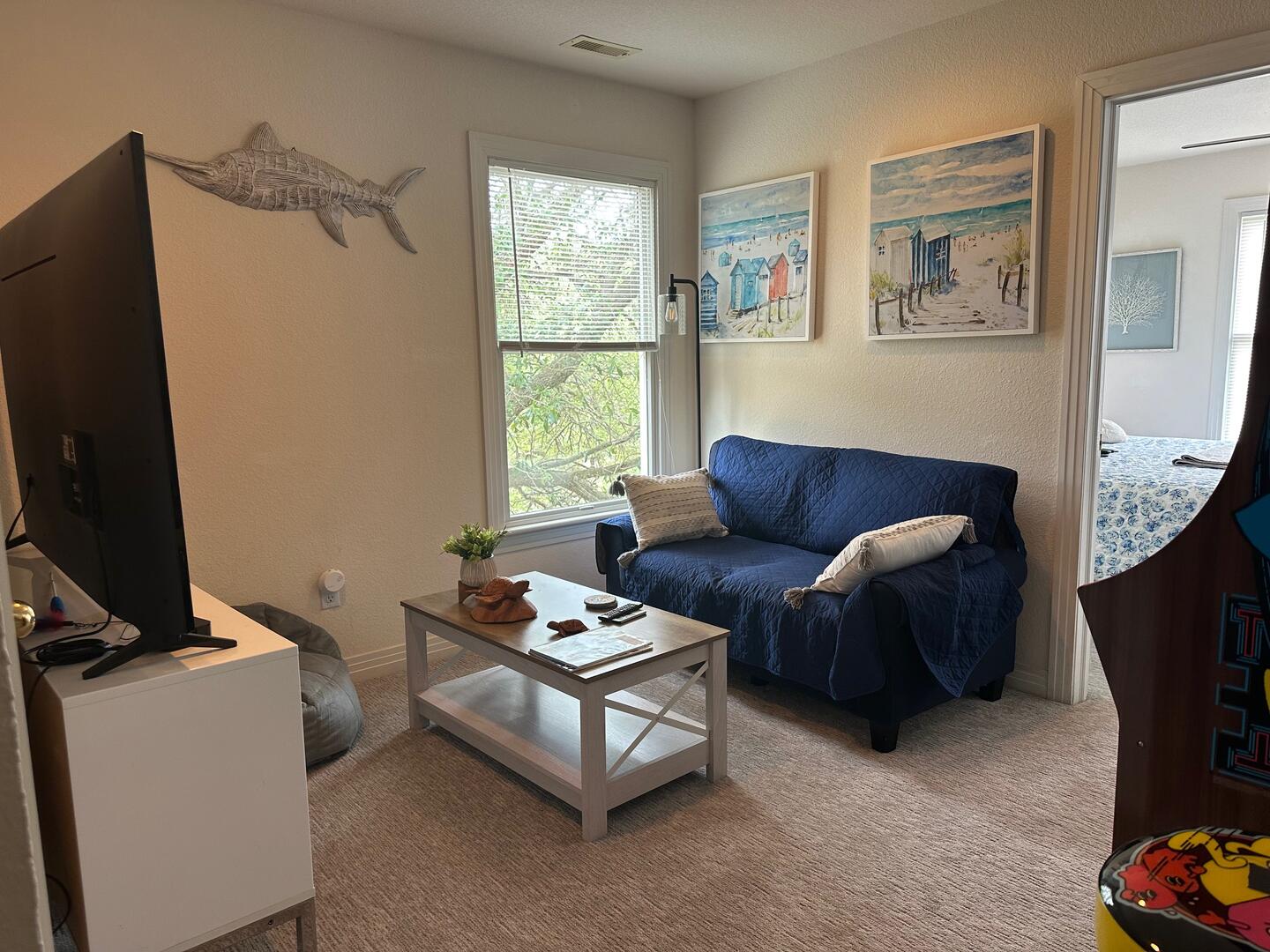 On the first level of the home, you will find a fully equipped kitchen, the cushy living room perfect for relaxing, a stylish dining area and a half bathroom. Step outside and hang out on the fully fenced-in patio area while you sip drinks watching the setting sun.