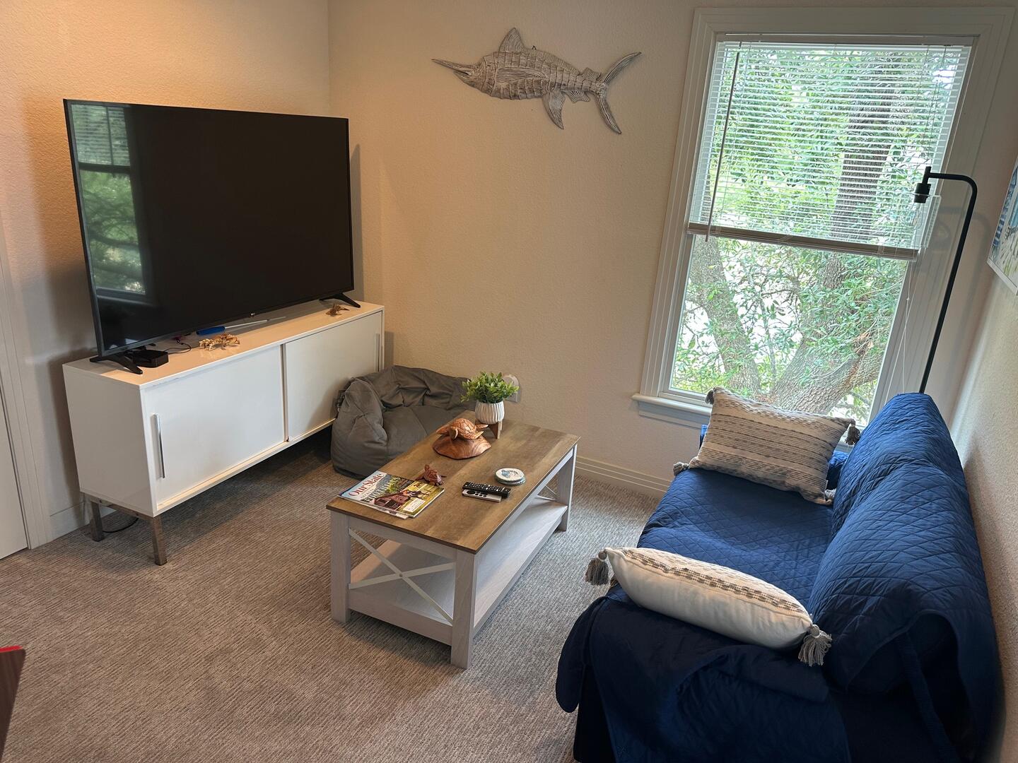 Walk up to the second floor and you will find a King En Suite with a 75-inch flat screen TV, and a Queen bedroom. A full common bathroom is located down the hallway. Lounge on the second floor sitting room and put a film on the 65-inch flat screen TV, perfect for a family movie night.