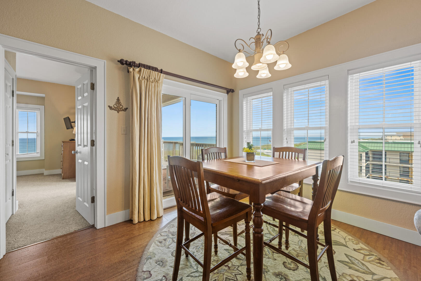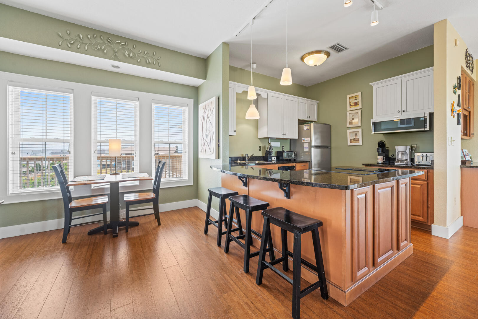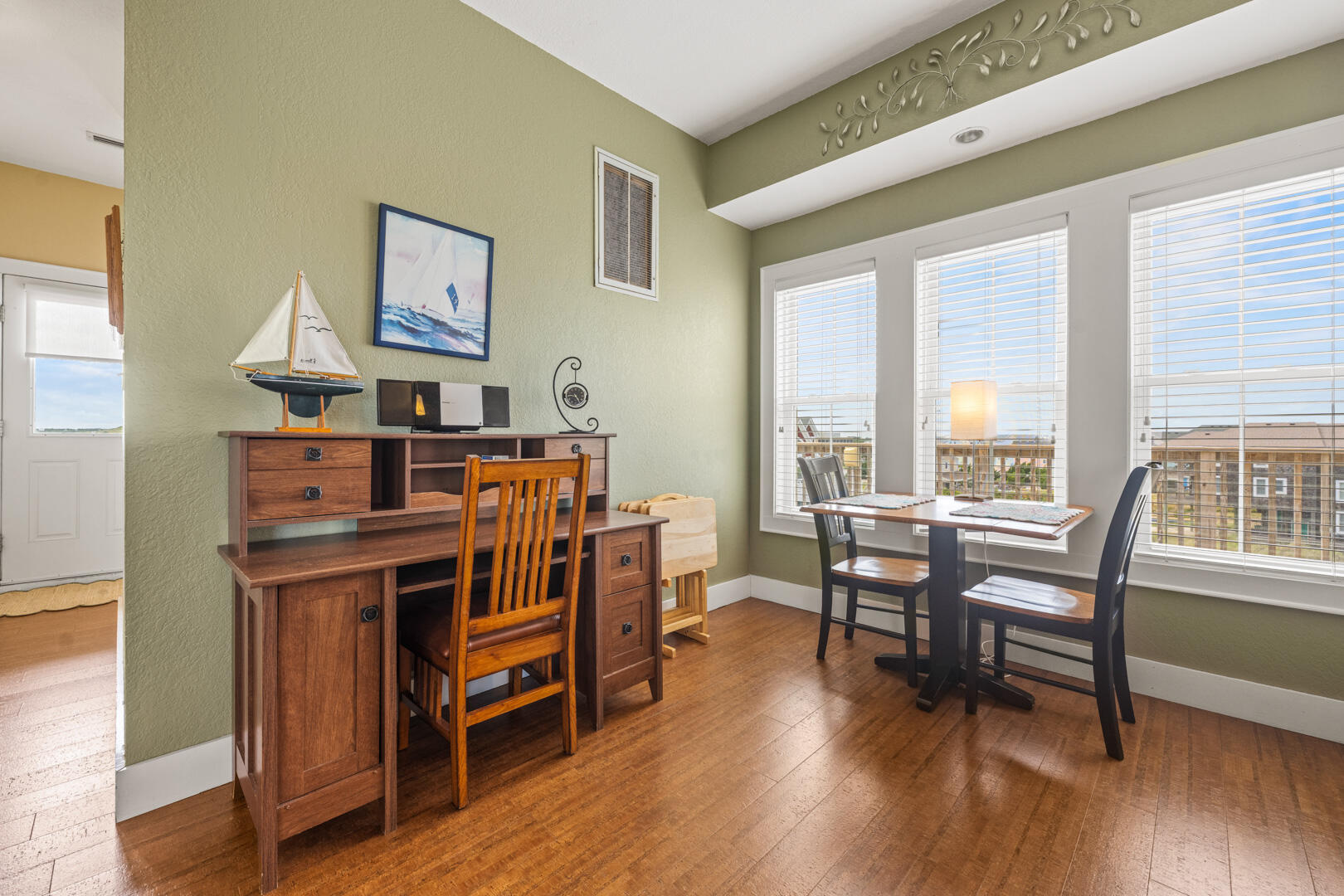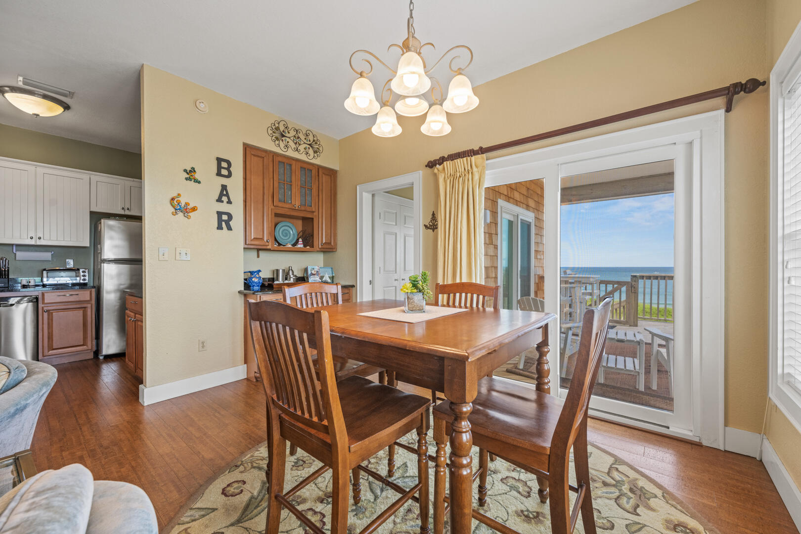 The great room features cozy furniture and a flat screen TV. A sleeper sofa provides an additional sleeping option. Window side dining space accompanies the kitchen, bar and living area. The kitchen, outfitted with granite countertops and space saving stainless appliances, is fully equipped for all your needs. Cork flooring, soft palettes and beadboard wainscoting blend modern and rustic moods. High ceilings create an airy feel and plantation blinds filter sunlight. Two additional oceanfront decks feature plenty of seating with prime vantage points to take in the stunning views of Kill Devil Hills and sunset views of the Wright Brothers National Monument.