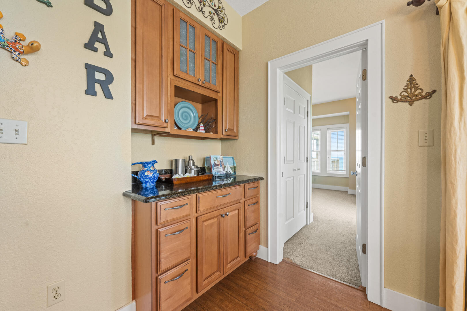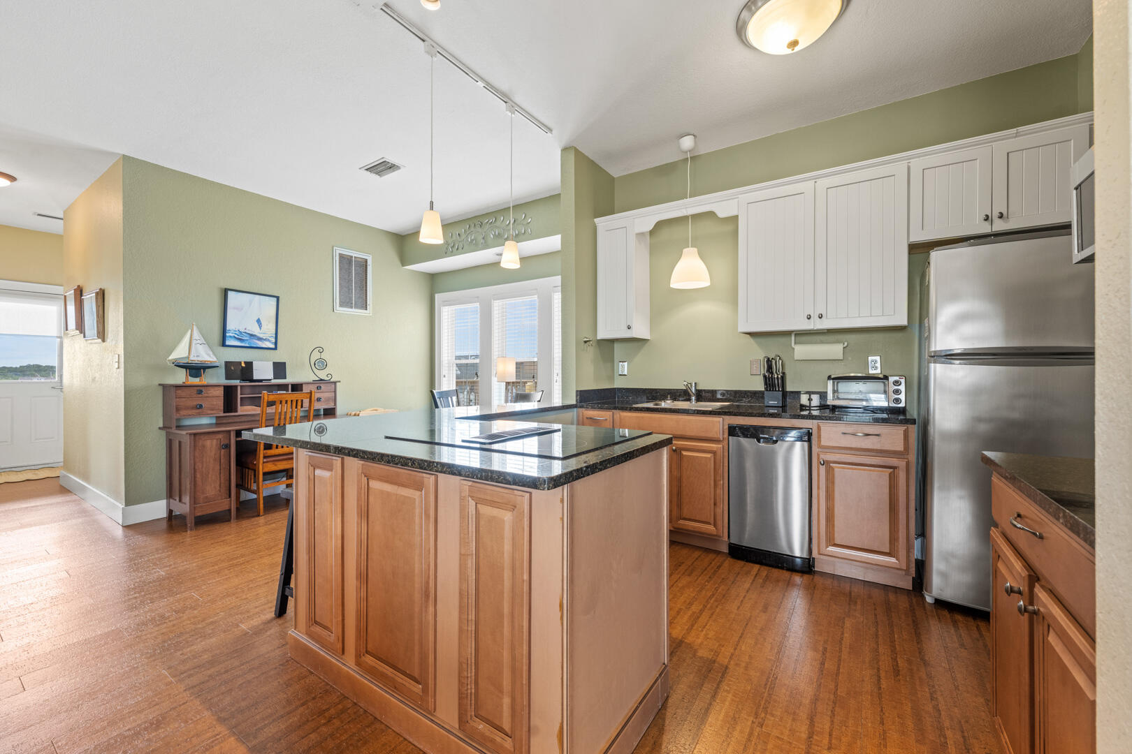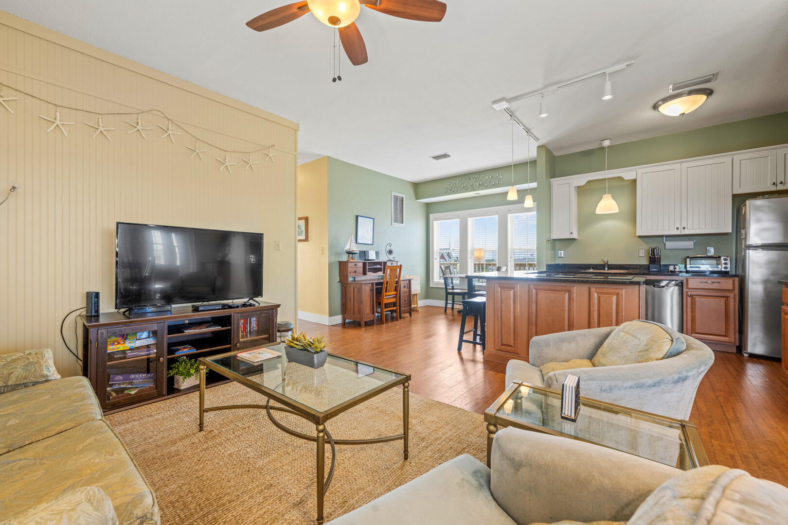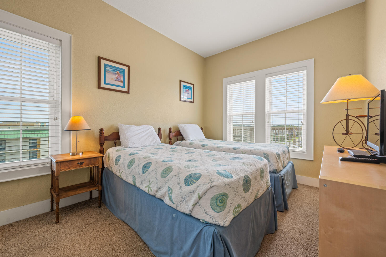 The great room features cozy furniture and a flat screen TV. A sleeper sofa provides an additional sleeping option. Window side dining space accompanies the kitchen, bar and living area. The kitchen, outfitted with granite countertops and space saving stainless appliances, is fully equipped for all your needs. Cork flooring, soft palettes and beadboard wainscoting blend modern and rustic moods. High ceilings create an airy feel and plantation blinds filter sunlight. Two additional oceanfront decks feature plenty of seating with prime vantage points to take in the stunning views of Kill Devil Hills and sunset views of the Wright Brothers National Monument.
