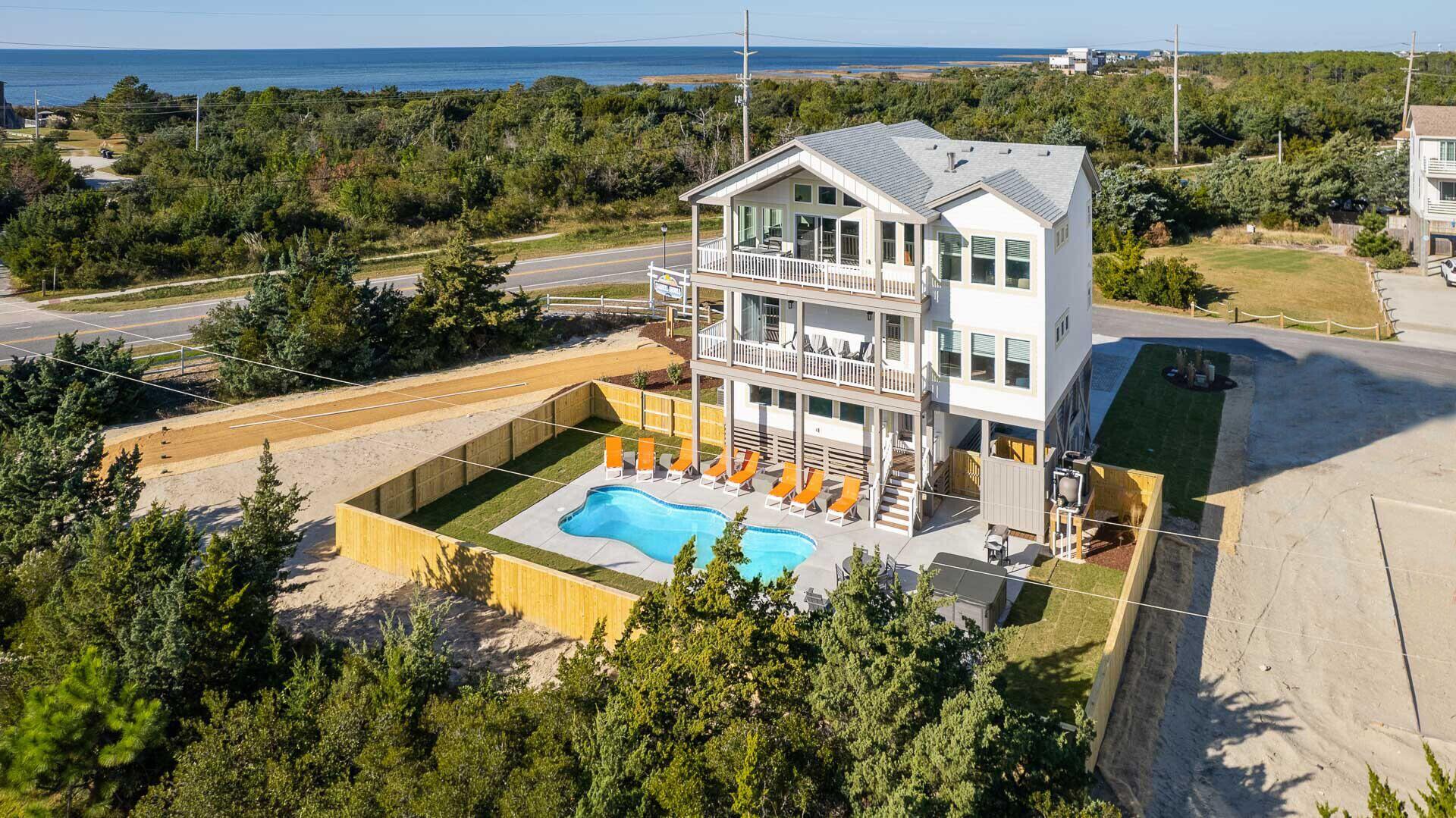 Let the sound of the waves carry you off into a deep sleep while staying at the beautiful home, Siren's Song. This stunning 6-bedroom, pet-friendly home is nestled oceanside in the village of Salvo on Hatteras Island. Enjoy easy beach access, a private pool and hot tub, and a recreation room with billiards while staying here with friends and family.