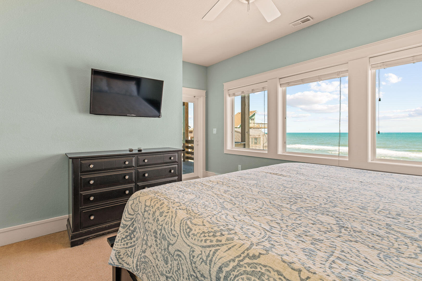 Heading up to the third level of the home, you will be greeted by the main living area with vaulted ceilings and wall to wall windows to ensure unobstructed, pristine ocean views! The Master King En Suite is also on this level and features a walk-in closet, master bath with a custom tiled shower and dual vanities, vaulted ceiling and slider to the oceanfront deck.