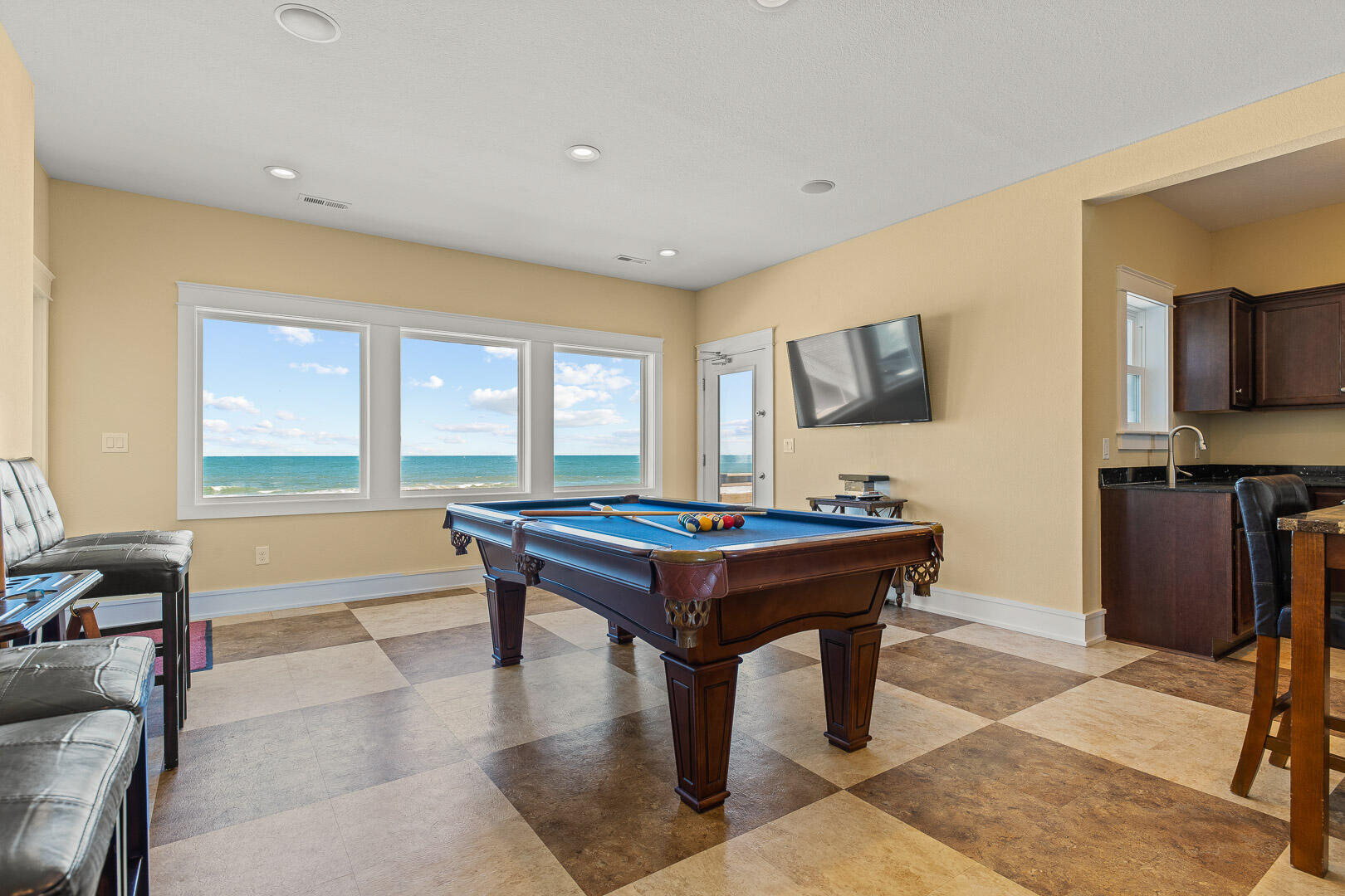 The main living room impresses with breathtaking blue-ocean views and the chic coastal decor makes you feel immediately at ease. Watch the morning news on the large screen home theater system while relaxing on the plush couches. Prep for a family dinner in the gourmet kitchen which includes an entertainment island, dual refrigerators, dual dishwashers for easy clean-up, 5-burner cooktop, dual wall ovens and microwave. When it's time to eat, sit down at the large dining table alongside a wall of windows, offering each guest a seat with a view of the panoramic Atlantic. Turn up the music, pour some drinks, and relax on the expansive sun deck, accessible from the great room, which provides unobstructed views of the Atlantic that will surely leave you awestruck.