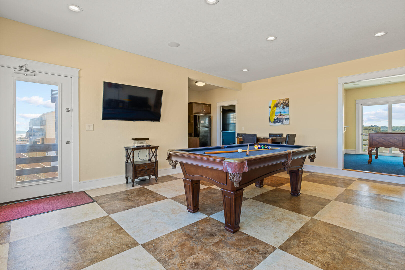 Entering the first level of the home, you will find a custom rec room with pool table and wet bar to aid in friendly competition. A kitchenette is equipped with a full-size refrigerator, microwave and stand-alone ice machine providing easy access to drinks, snacks, and ice for the cooler. You will find two bedrooms on this level - A King bedroom with deck access, and a kid-friendly bunk room with two Pyramid Twin bunks. There is a full shared bathroom in the hallway.