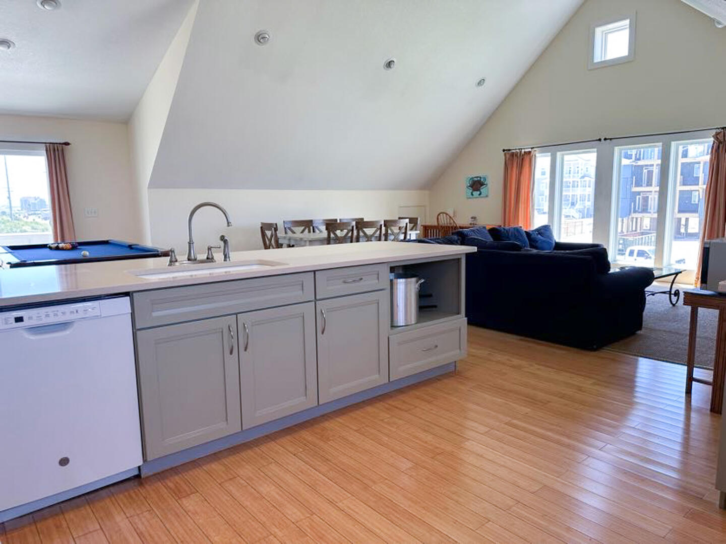 We really enjoyed our stay here. The place is large and very roomy for the six of us. you enter in a long, wide hallway with bedrooms, bathrooms and laundry room off the sides and end up in a large great room with a big kitchen, large couch, and large dining table. The pool table and shuffleboard are nice features and kept the kids entertained. The apartment is above a retail establishment but when we were there there it was very quiet and that was not an issue. Beach access from here is good. You just walk across the street and access the beach by walking along the path next to the hotel pool. Having access to the hotel pool was very nice as well. There was a place to rinse off the sand and salt water right next to the pool. I liked the location and the apartment and would stay here again- Christopher , Posted: 05/29/2021