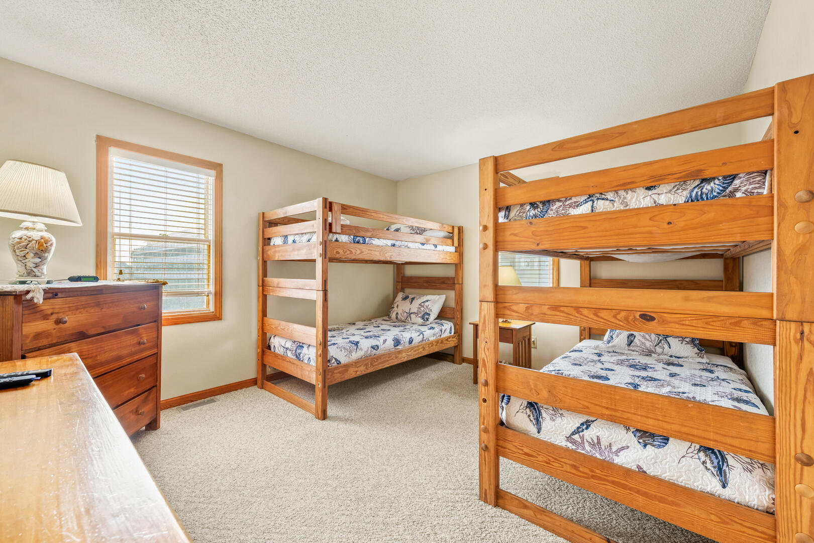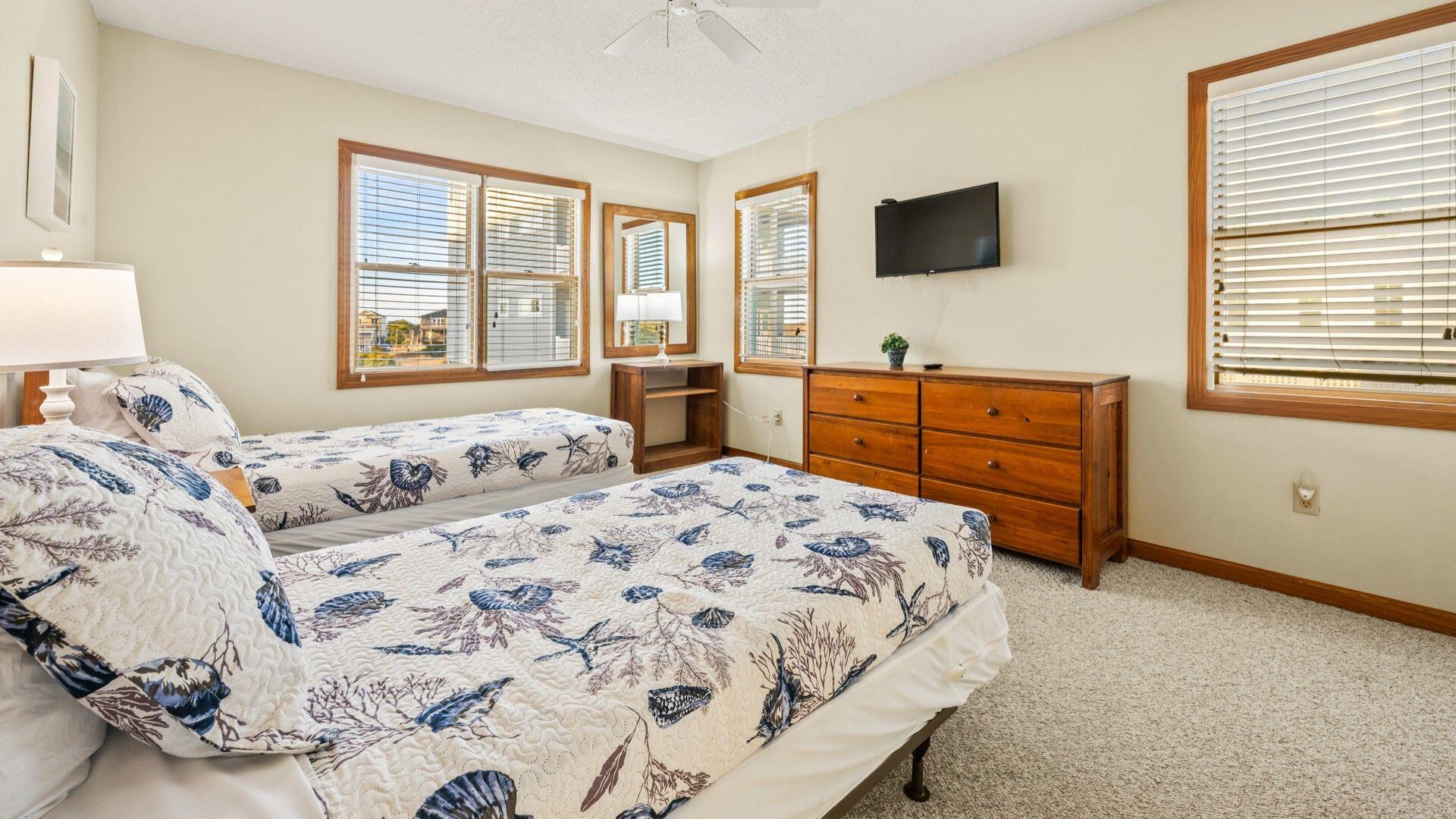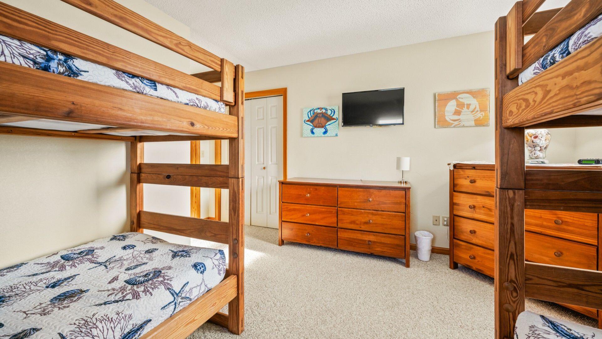 Entering the home at the foyer, you'll notice the entry level is where a majority of the bedrooms are found. An expansive King En Suite awaits those who prefer the privacy of a personal bathroom. Two Twin bunk beds and two single Twin beds are divided between the other two bedrooms on this floor, as well as a shared full bathroom in the hallway.