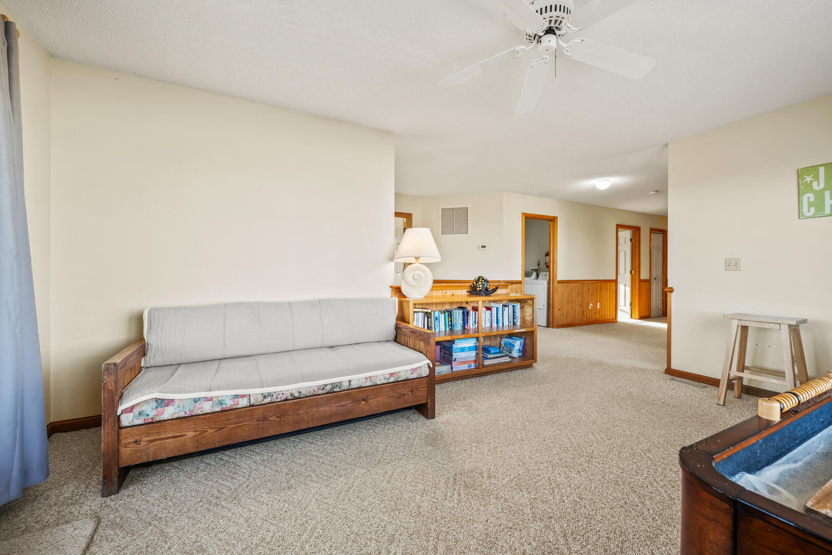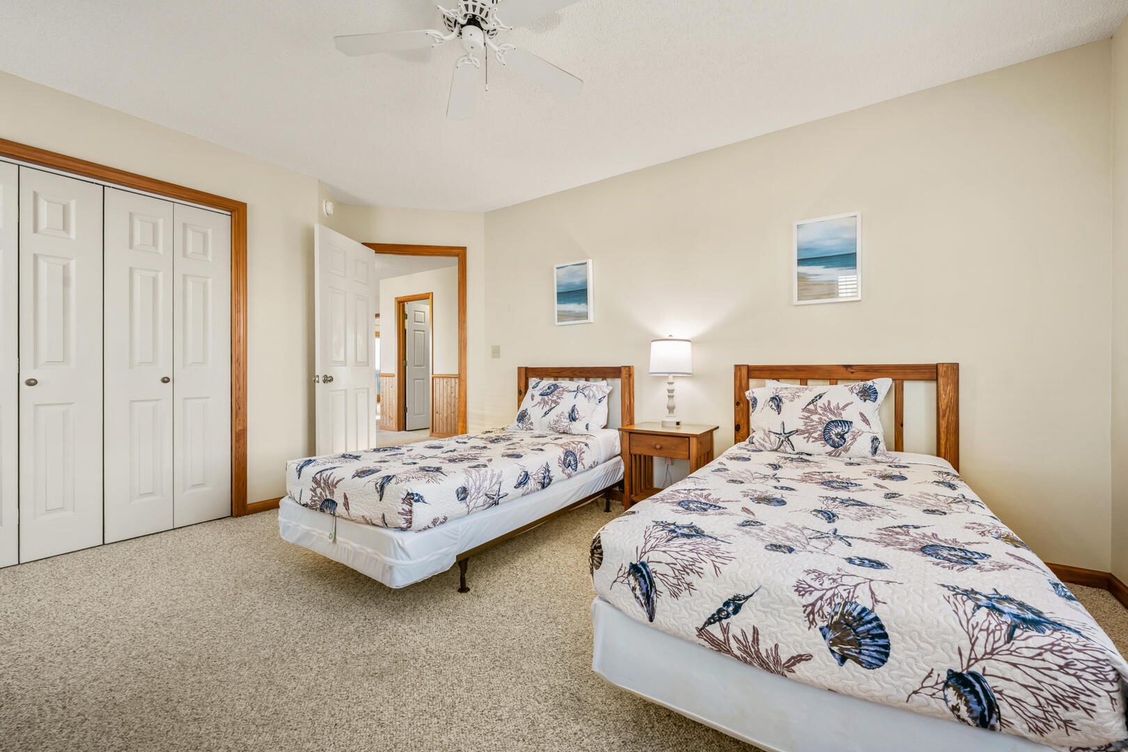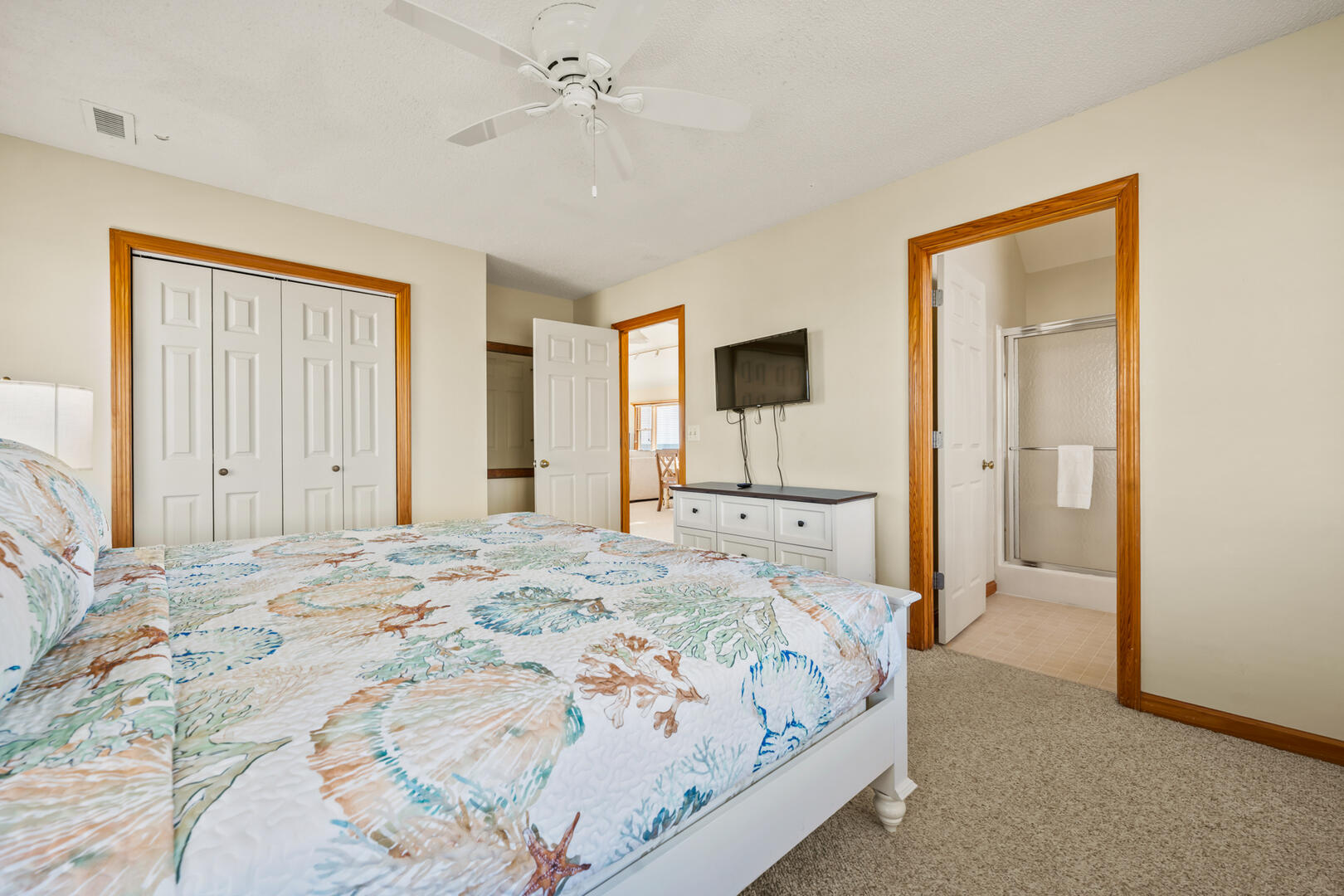 Entering the home at the foyer, you'll notice the entry level is where a majority of the bedrooms are found. An expansive King En Suite awaits those who prefer the privacy of a personal bathroom. Two Twin bunk beds and two single Twin beds are divided between the other two bedrooms on this floor, as well as a shared full bathroom in the hallway.
