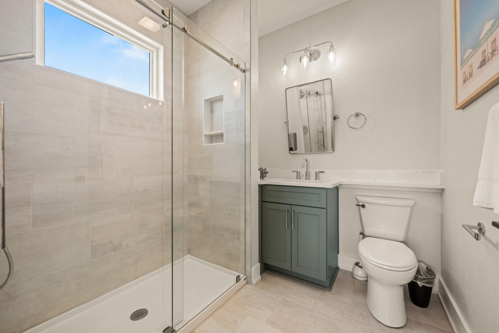 On the fourth level is where gathering for the entire group will take place. The chefs of the group will enjoy the gourmet kitchen with two refrigerators, two dishwashers, and two ovens. Also, on this level is a dining area, large living area and gathering space with lots of room. There are two washer and dryers on this level if you want to have clean towels for the beach each day. Another half bath is up here as well. For those who don't want far to go to get to sleep or like to get up early for that fresh cup of coffee, you will find 2 more King En Suites on this fourth level. One of the En Suites is handicap accessible with a roll in shower and roll under vanity.