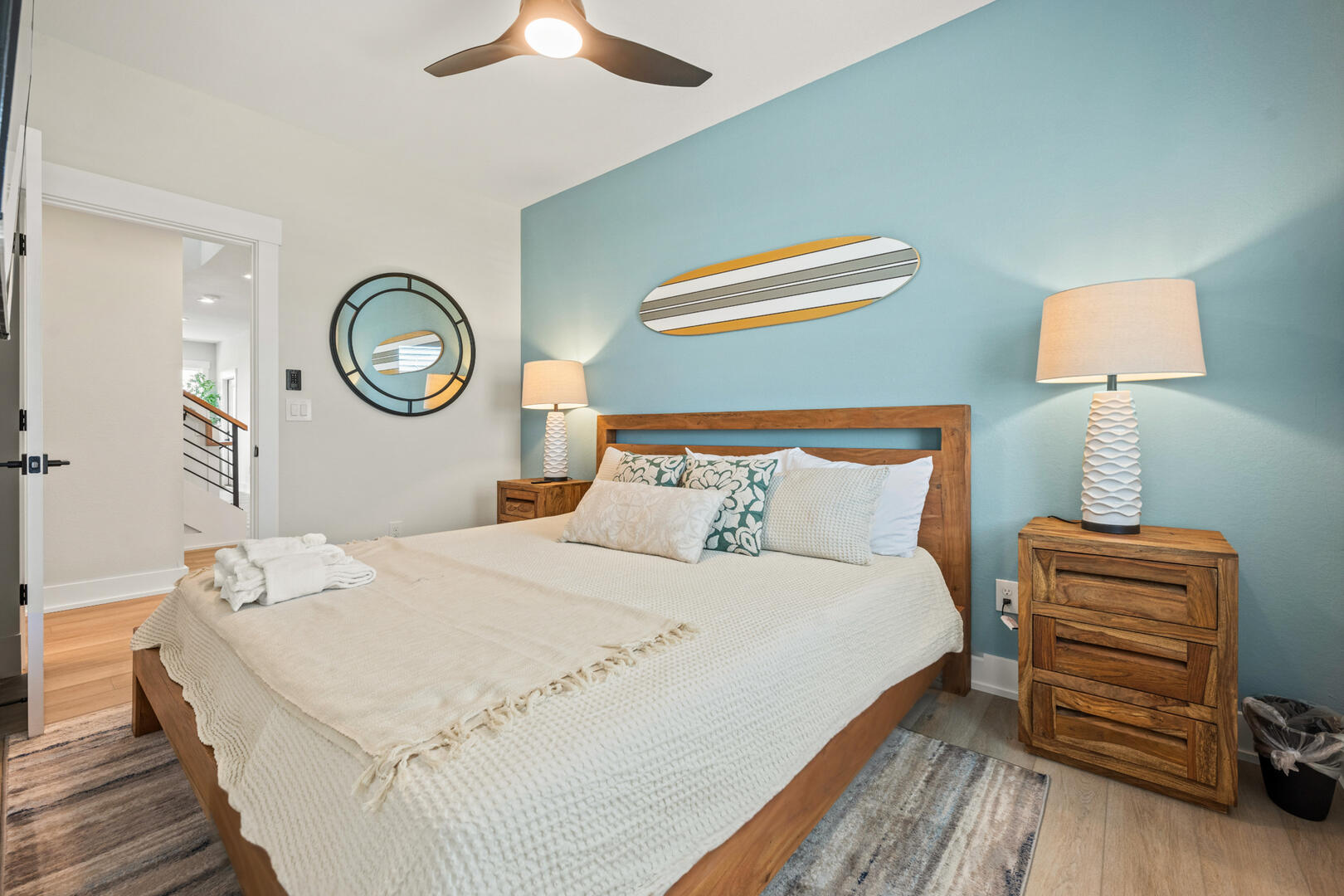 Head up to the third level to find more sleeping arrangements. There are five King En Suites up here, four of which have private deck access. With the kids in the group enjoying the recreation room downstairs, the adults can enjoy the Ocean Lounge with a pool table, tv, and wet bar. The wet bar has a wine fridge as well as an ice maker to ensure all the drinks stay cold.