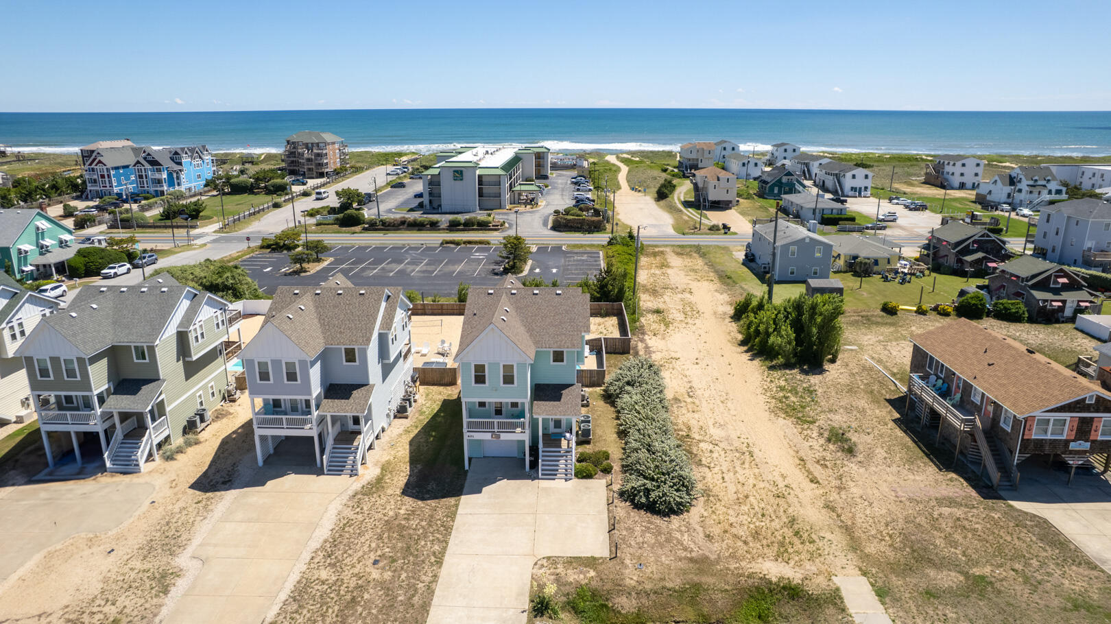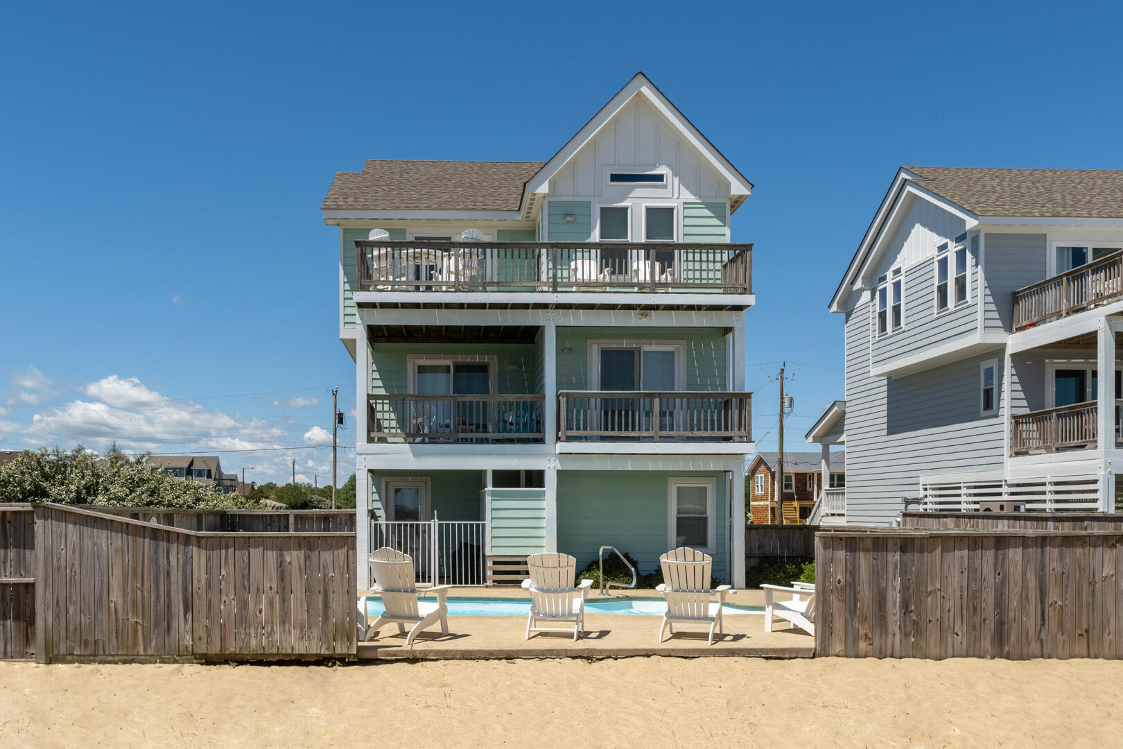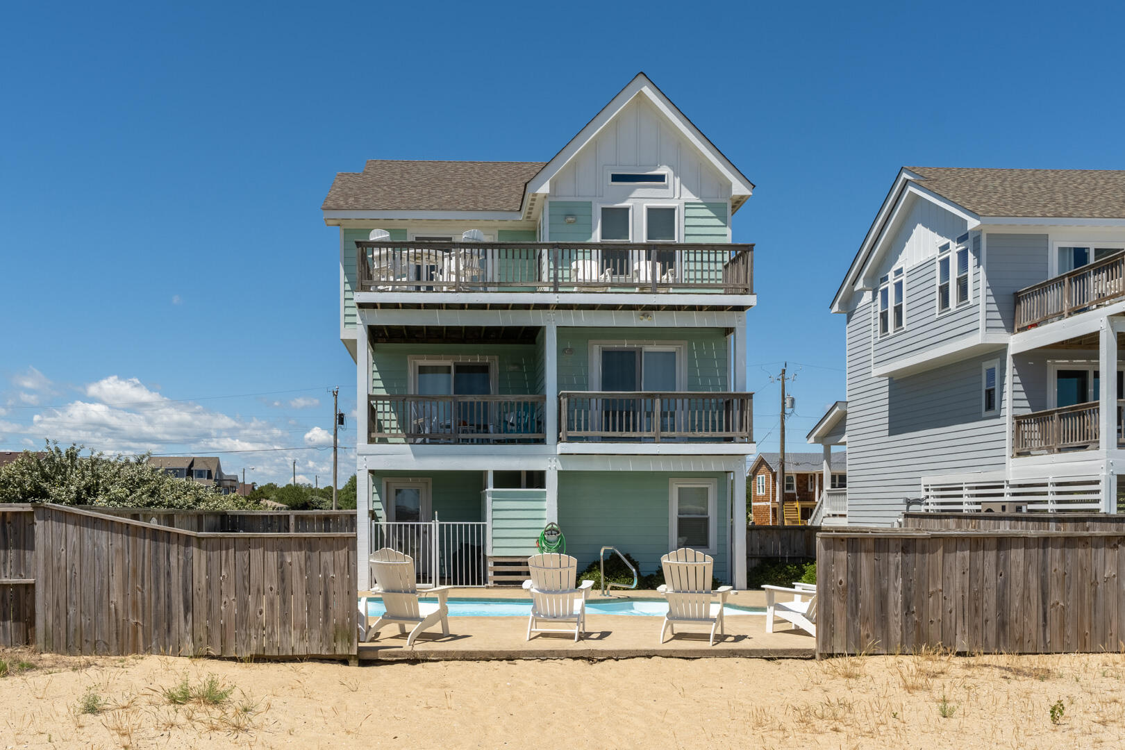 See the beautiful blue ocean from Bikini Bottom! Spend your precious Outer Banks vacation time on the third level deck of this lovely 4 bedroom, 3 full and 2 half bath home and enjoy watching the waves just 2 blocks away. You are so close you might even feel the ocean mist on your face. Spend hours frolicking with your family and friends in the inground pool. The fenced-in backyard also features a huge sandy area for kiddos of all sizes to play! The spacious pool deck features plenty of comfortable sun loungers for soaking up the sun!