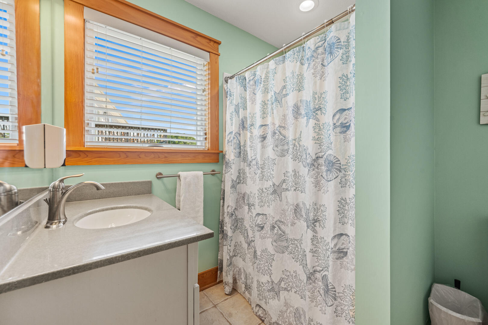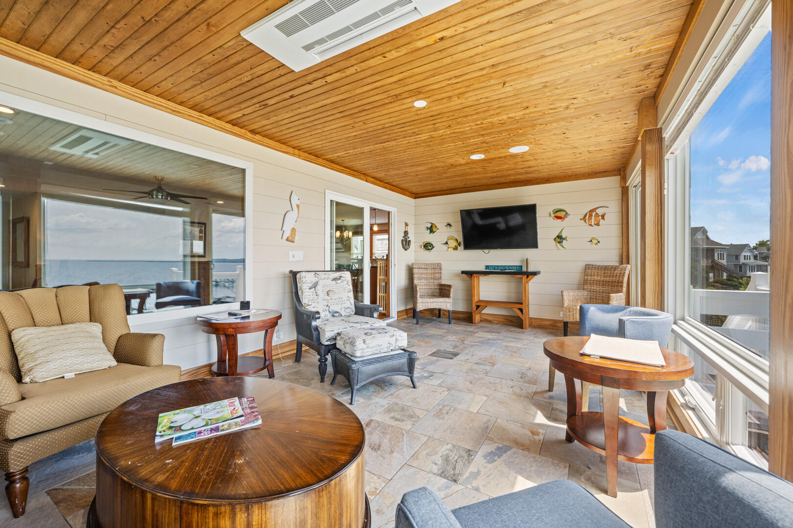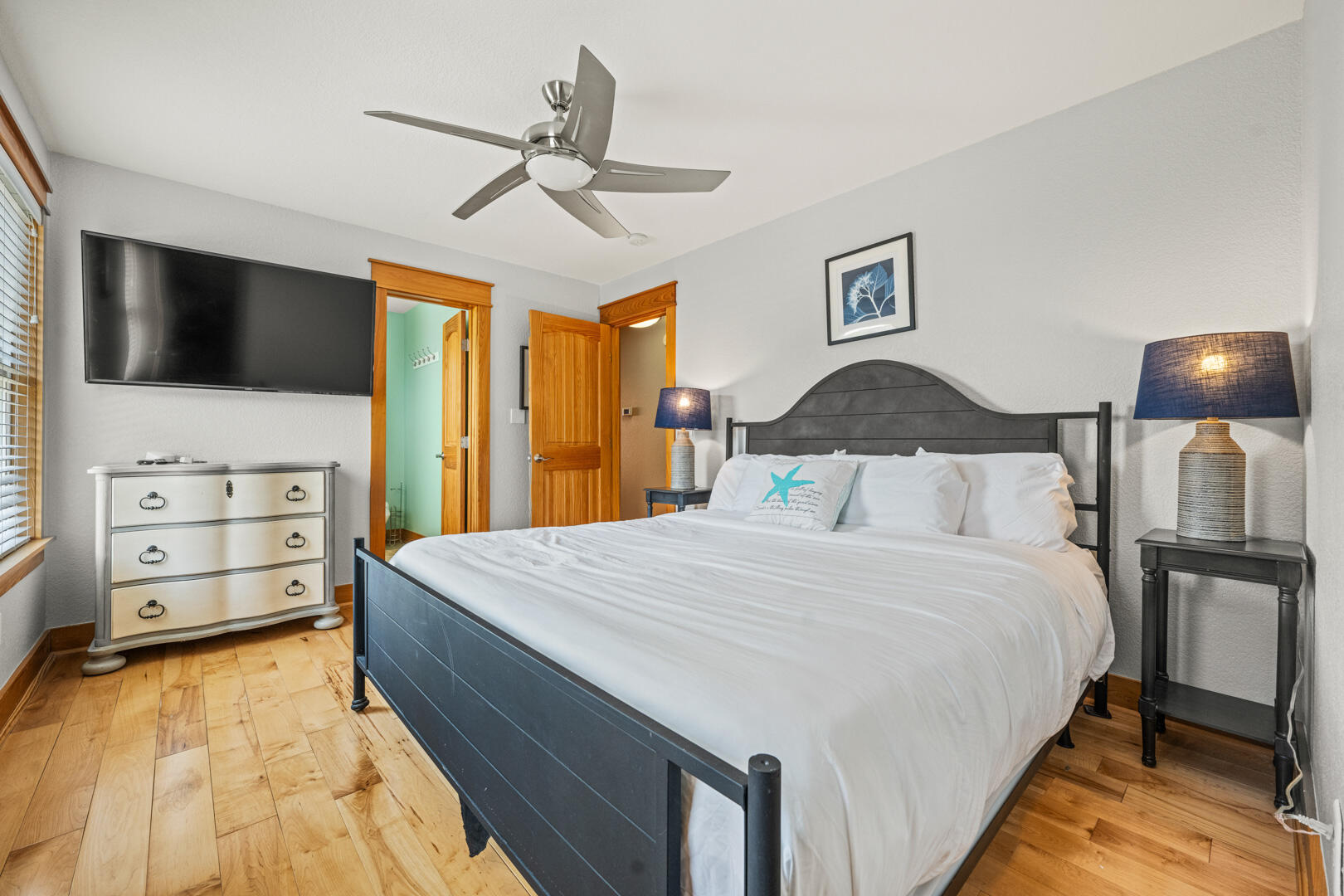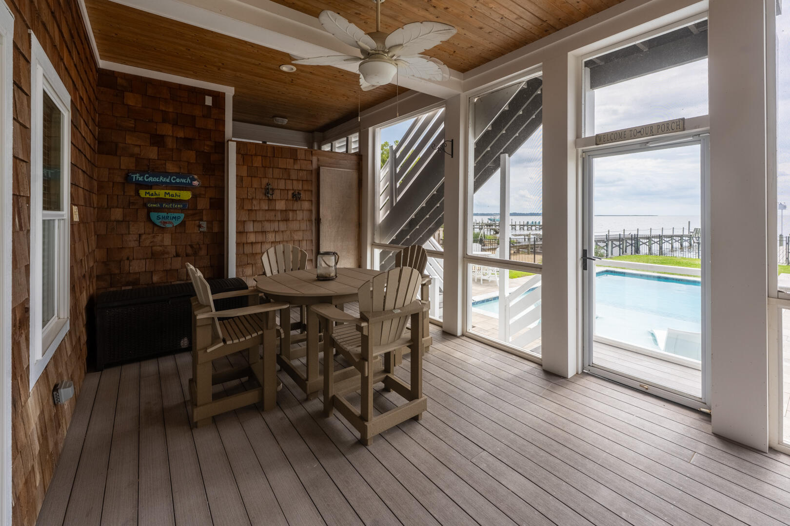 Going down to the second level, one will find a large granite kitchen well equipped with cookware, dining ware, and a gas stove. Adjacent to this is a dining area with a table for 6 as well as a bar with seating for an additional five. This level is where the majority of guests will rest after their long days of relaxation and fun. There are 3 En Suite bedrooms, two Kings and a Queen, each with its own full bath. This level also provides access to an unbelievable tile, conditioned, sunset porch where you can kick back to relax on the Bay in style! There is also a washer and dryer on this level for guest use.