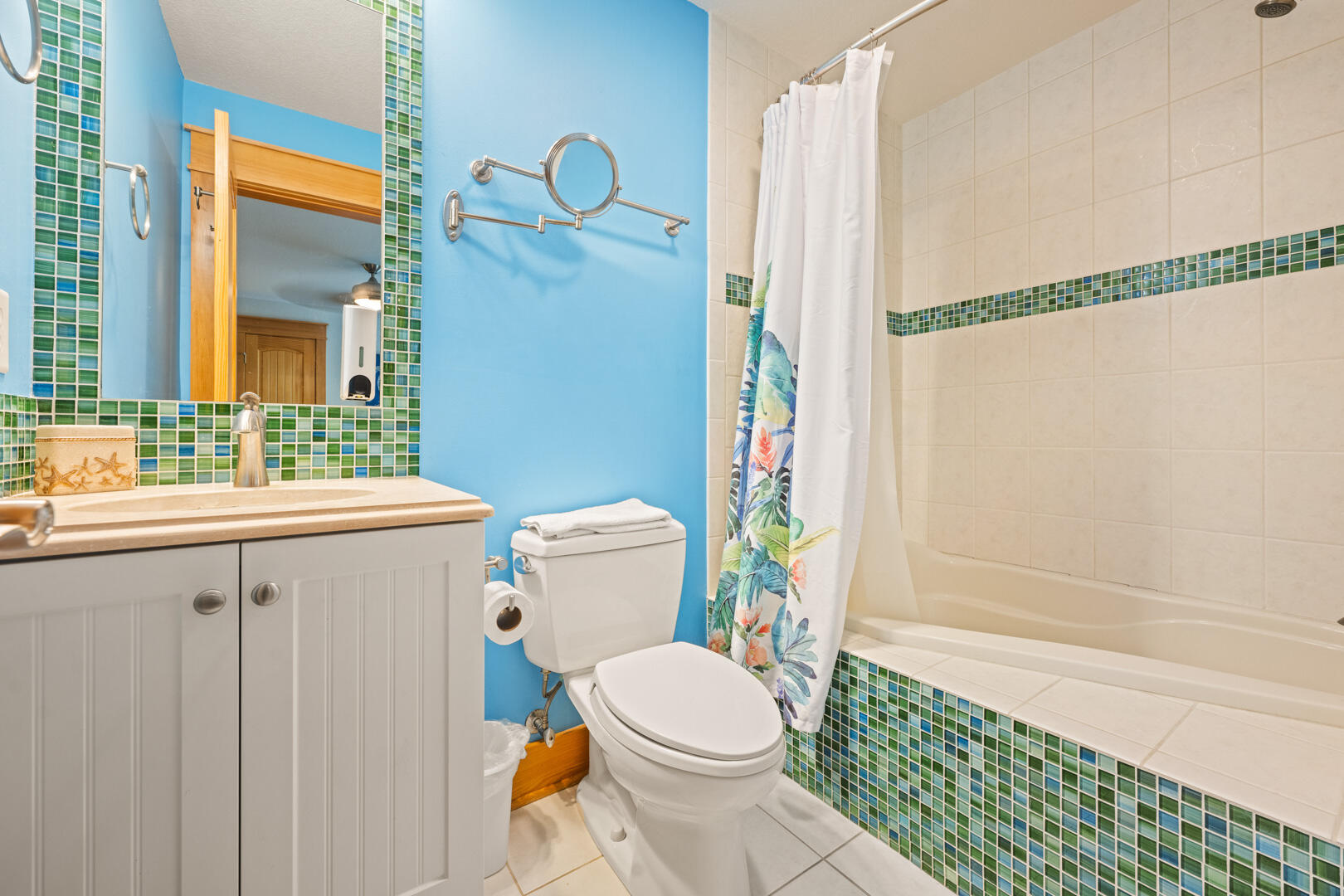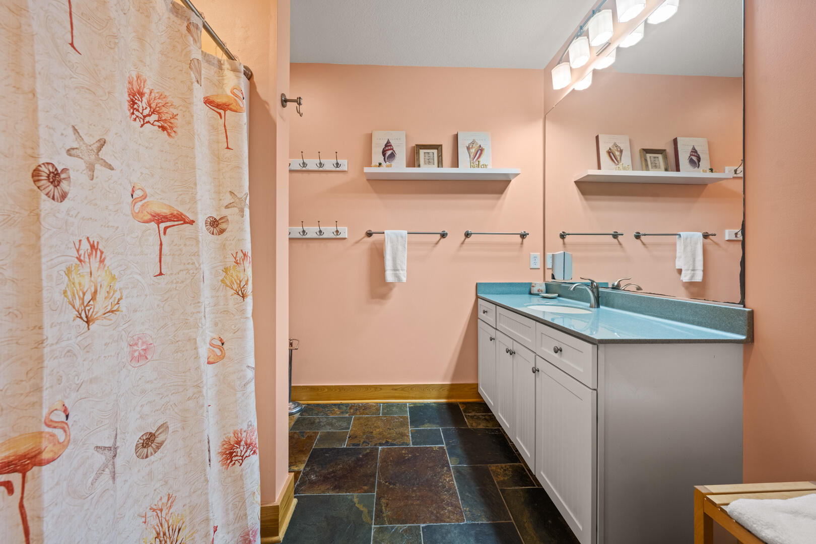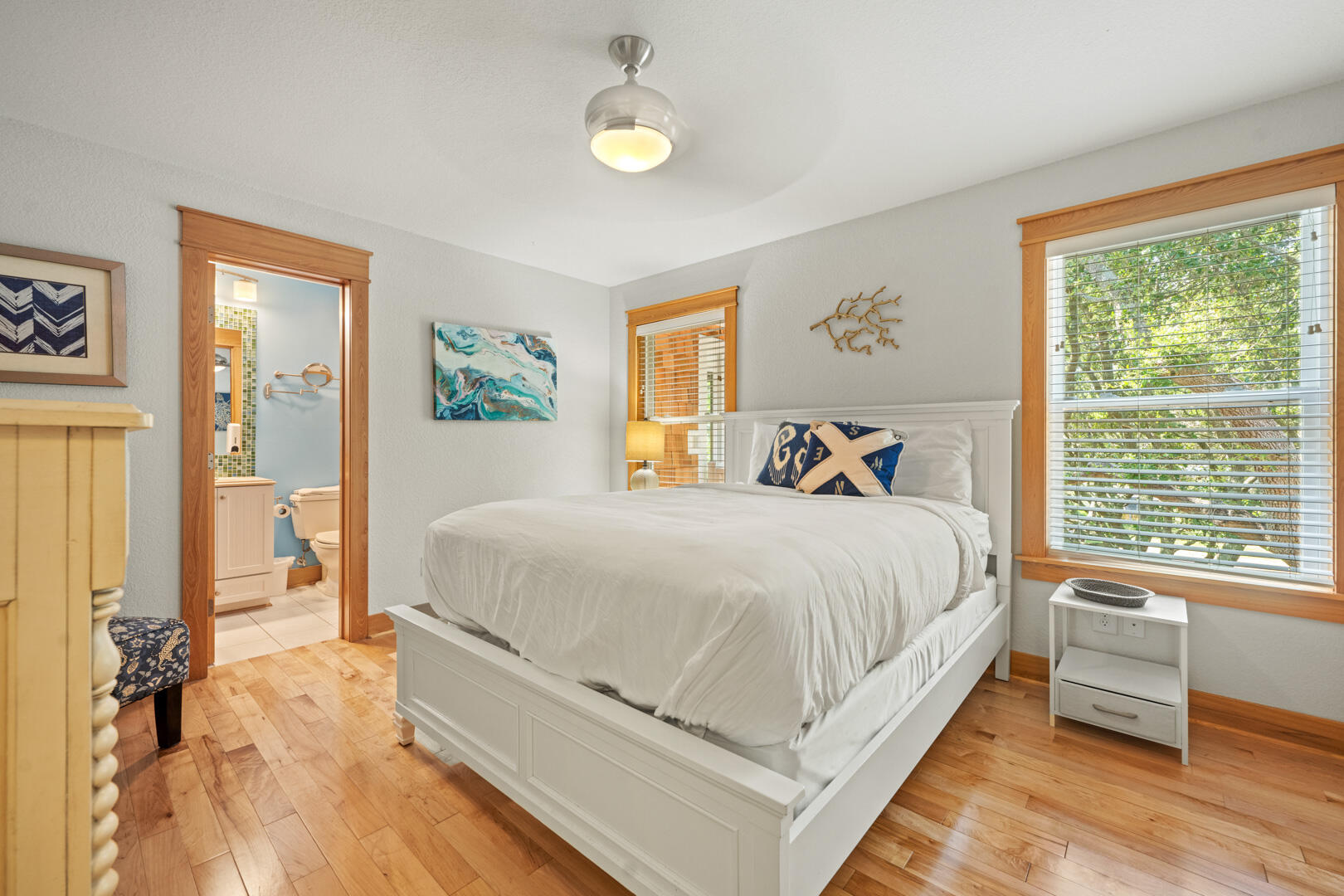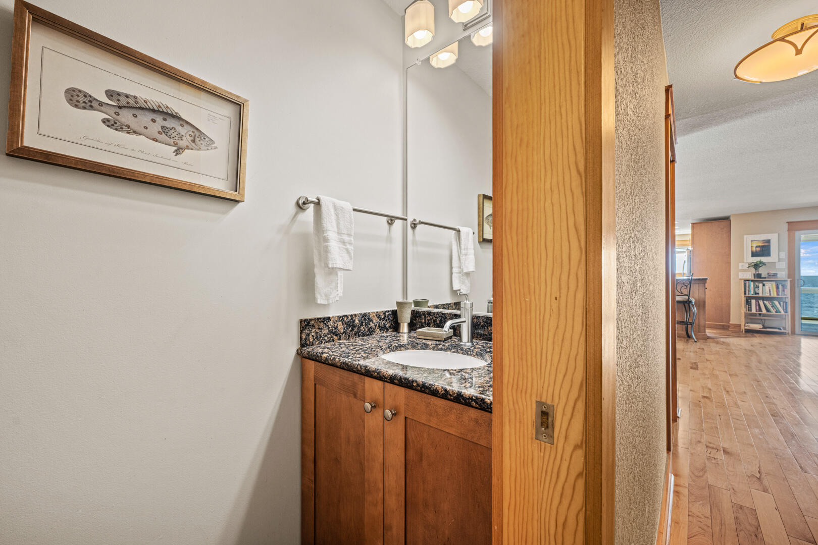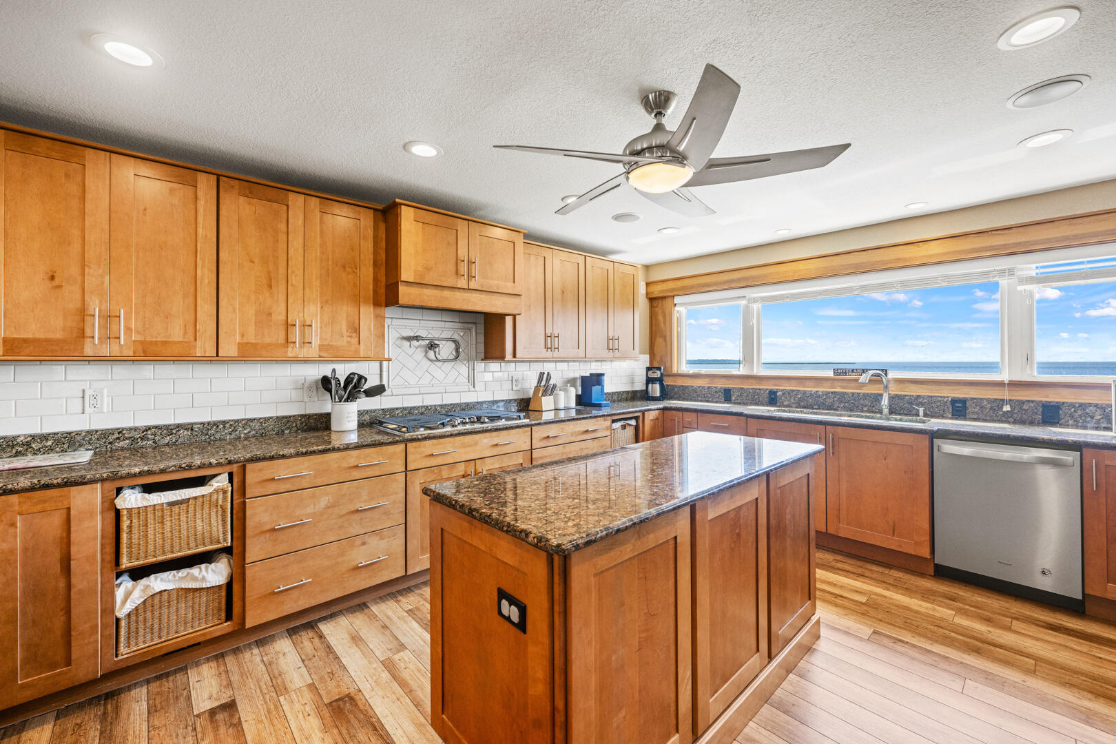 Going down to the second level, one will find a large granite kitchen well equipped with cookware, dining ware, and a gas stove. Adjacent to this is a dining area with a table for 6 as well as a bar with seating for an additional five. This level is where the majority of guests will rest after their long days of relaxation and fun. There are 3 En Suite bedrooms, two Kings and a Queen, each with its own full bath. This level also provides access to an unbelievable tile, conditioned, sunset porch where you can kick back to relax on the Bay in style! There is also a washer and dryer on this level for guest use.
