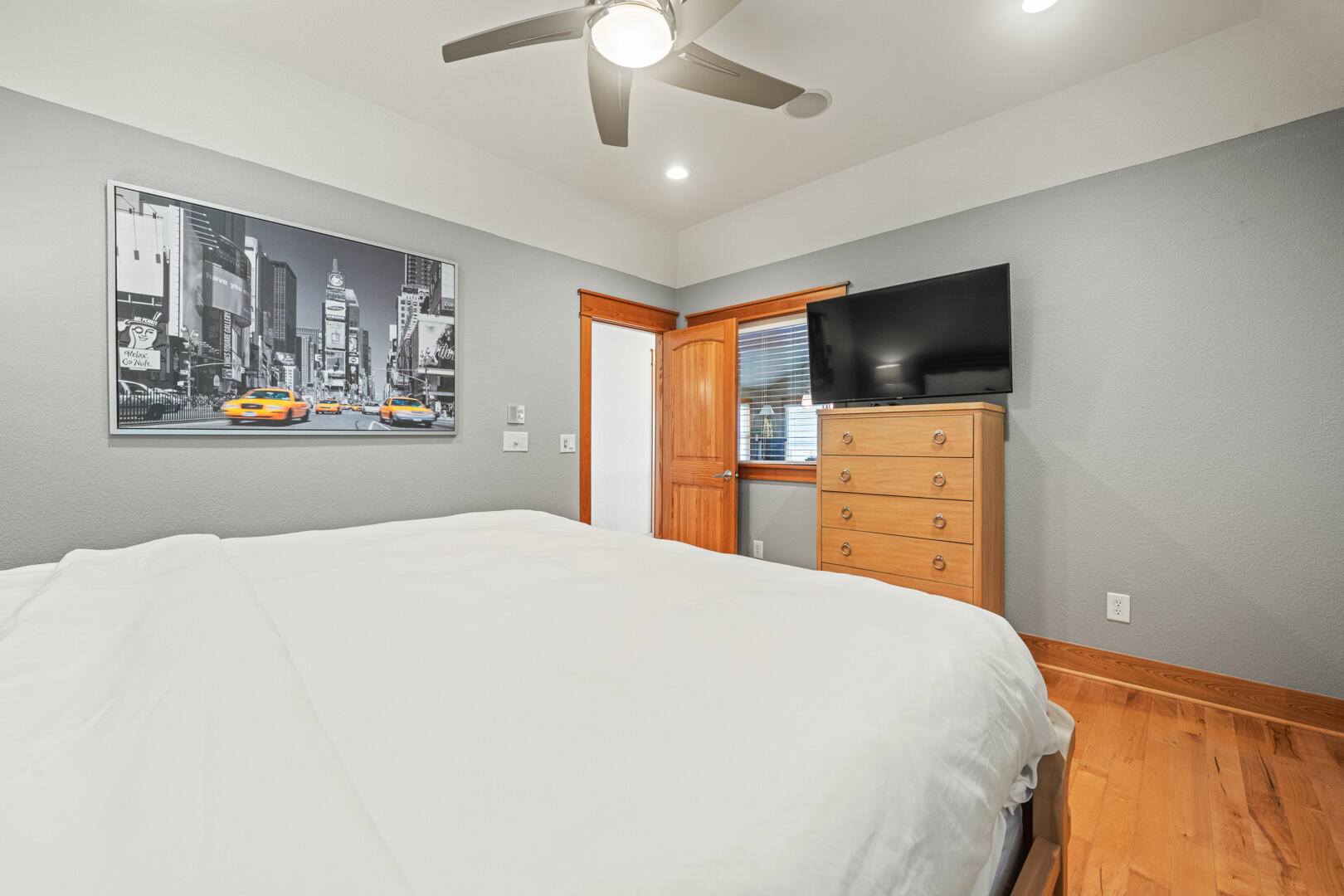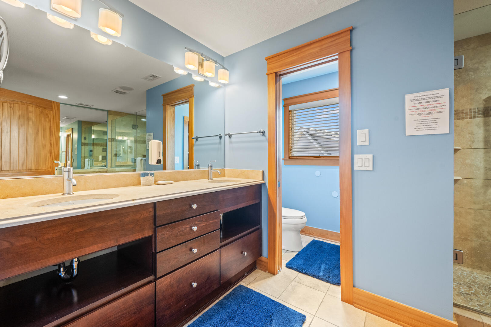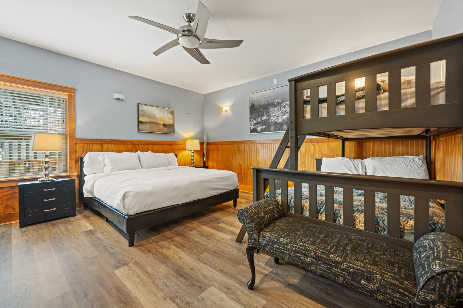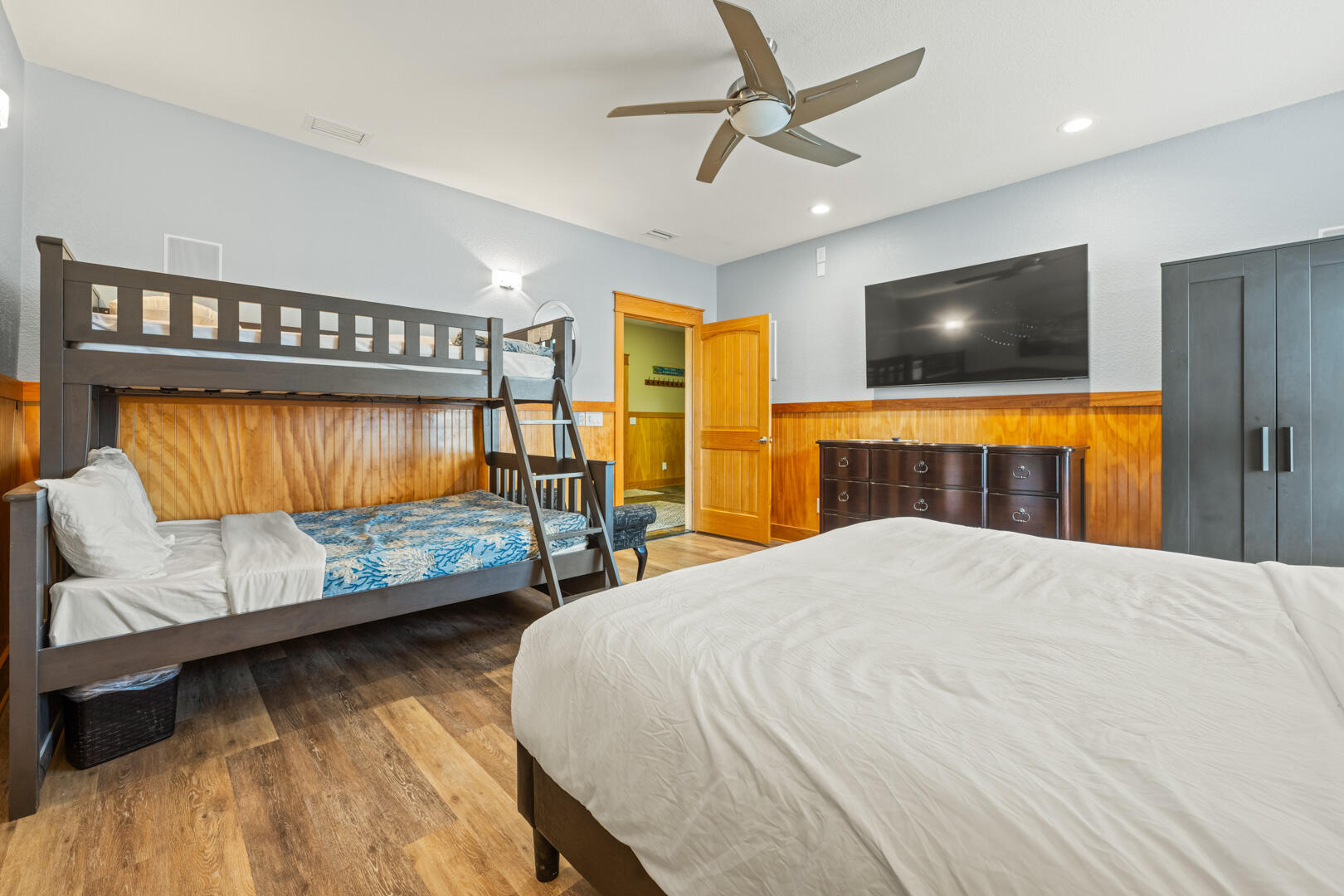 The third level hosts an enormous King En Suite, with a fireplace and a large screen TV. Enjoy taking a bath in the large soaking tub or a quick shower in this shower built for 2! After that, relax in one of the recliners to catch your favorite show away from the hustle and bustle of all the family. This level will also be the site of many bonding experiences, as a sitting area with another large, flat screen tv and full mini bar is located here. If you are in the mood for a board game or a hand of cards, this room features a 6-person, high-top table.