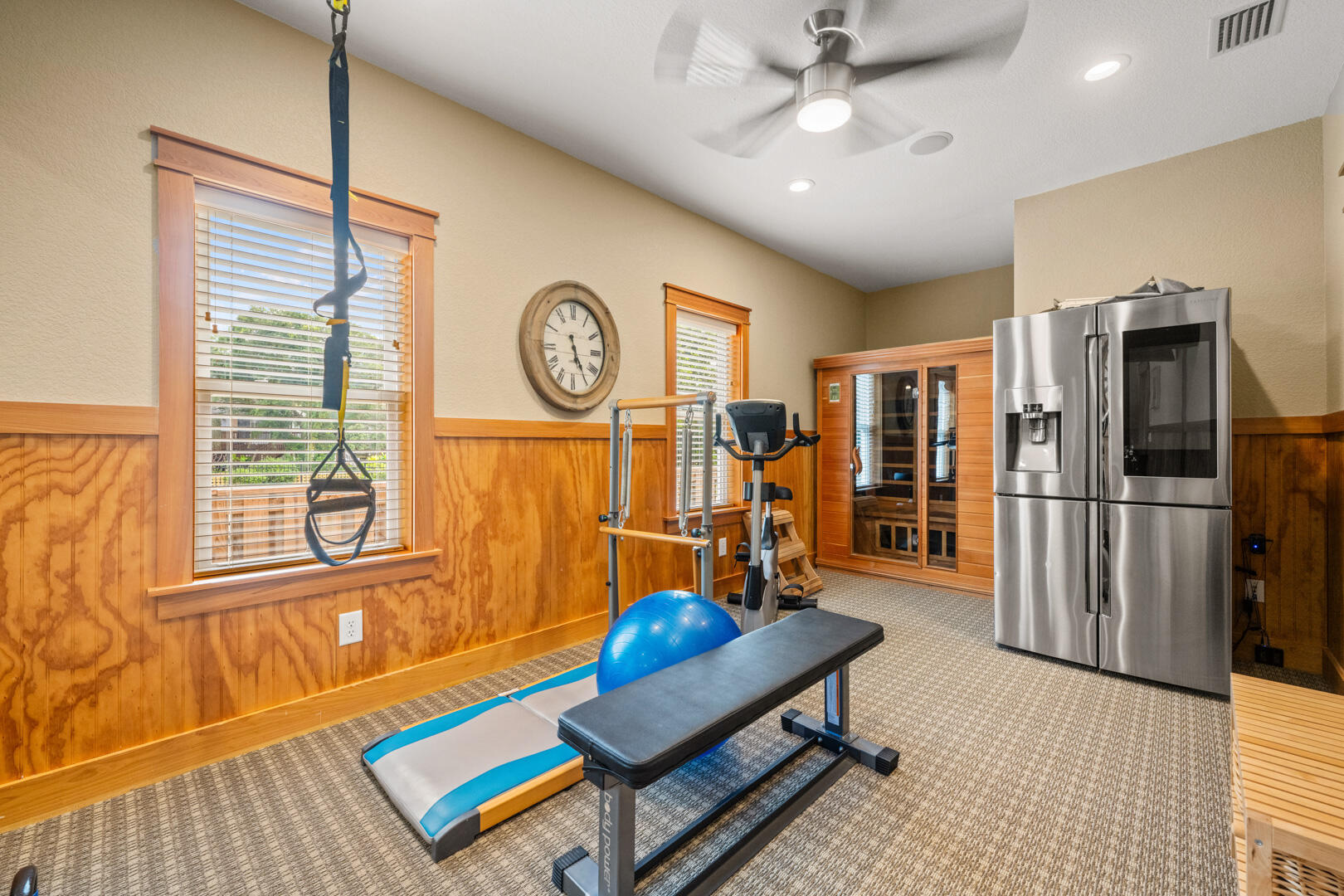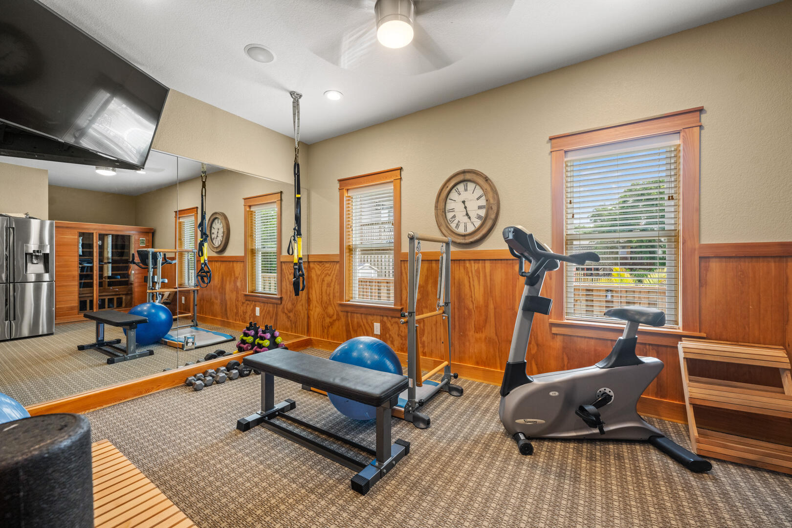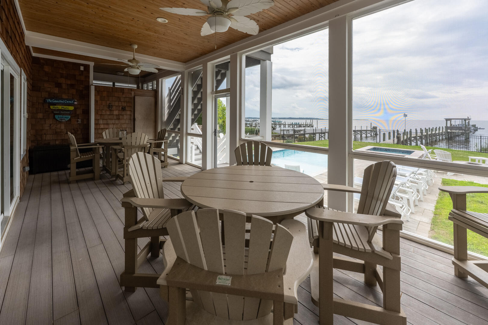 As morning dawns on your cozy, five-bedroom getaway, you can enjoy your morning cup of coffee in the full kitchen or on one of the three porches that overlook the Kitty Hawk Bay and Albemarle Sound. This fabulous retreat home offers many amenities to keep the whole family entertained throughout the whole day and well into the evening. You might want to just relax in the concrete pool and hot tub. Maybe you would like to work out in the gym that is equipped with a large flat screen TV, a stationary bike, the Total Body TRX Suspension Trainer and some free weights. You can then relax in the sauna.
