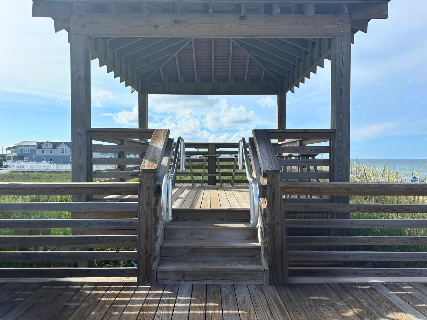 When it is time to go to the beach, there is a private beach walkway for the entire oceanfront community to use. You will find bench seating and a gazebo as you walk towards the ocean. The view from the top of the steps never gets old.