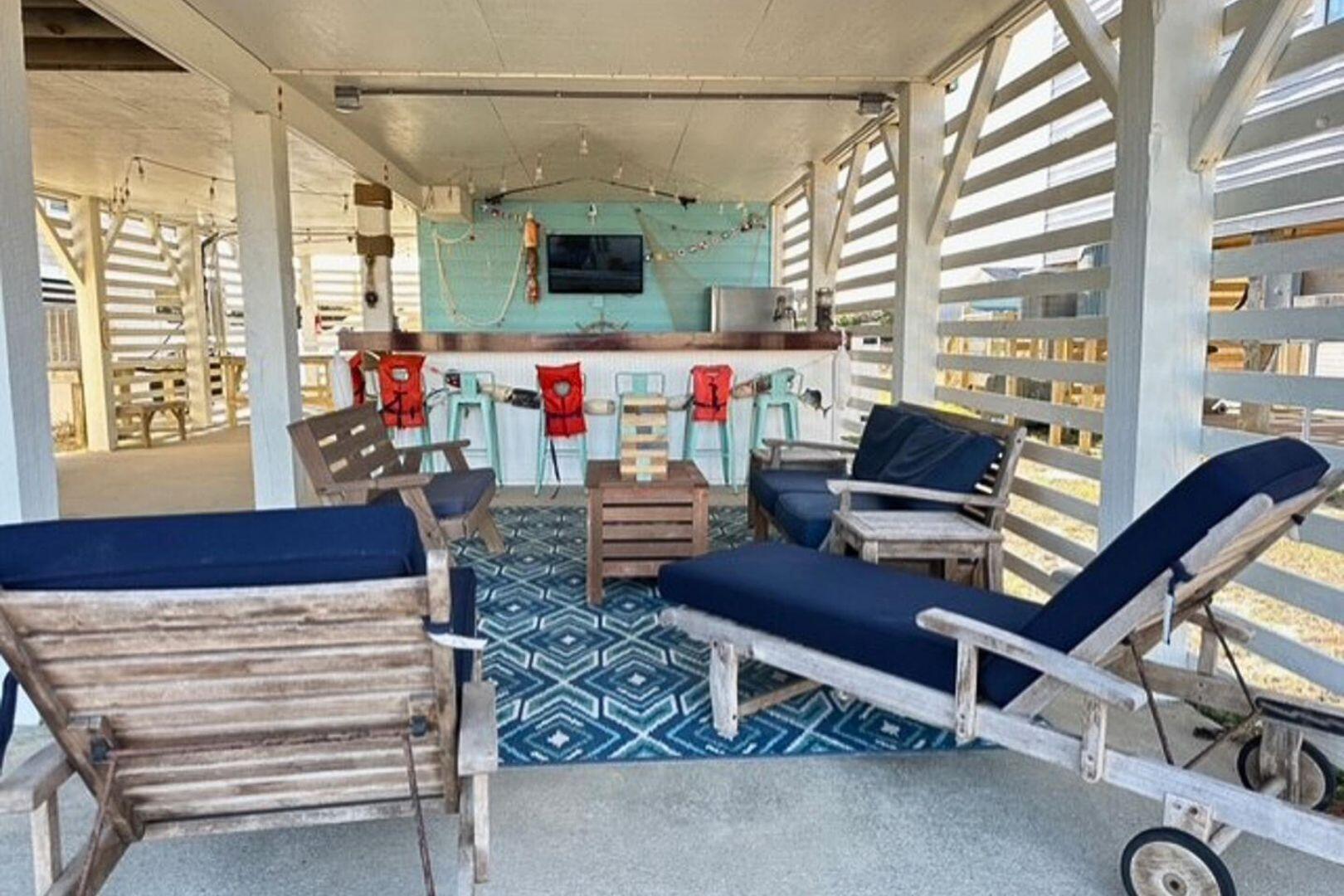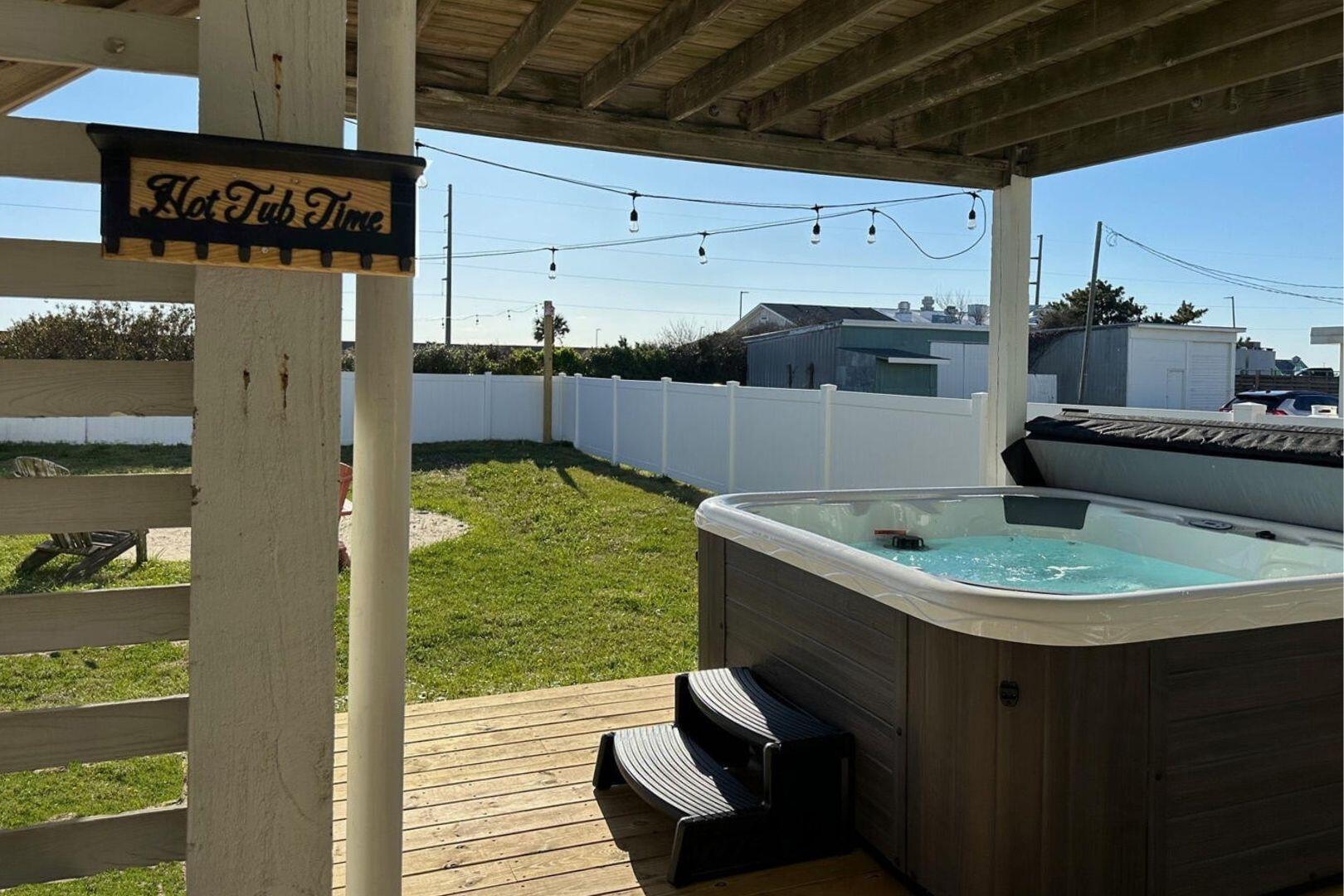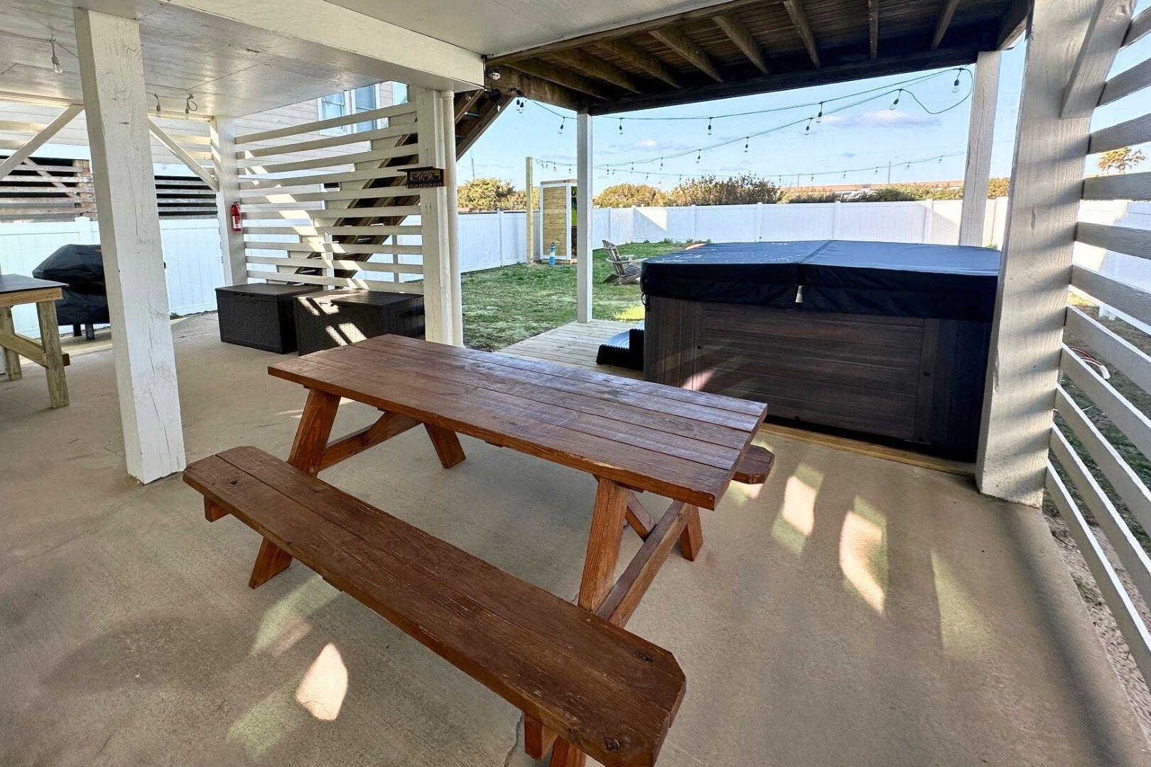 The outside of the home is just as cozy as the inside. Enjoy your coffee on the front deck and watch the sunrise with a sneak peek of the waves crashing. In the evening you can enjoy the back deck and watch the sunset over the sound. The backyard has been updated to include string lighting with a fire pit for roasting marshmallows or just enjoying a fire on a cooler evening. Relax in the private hot tub for the ultimate in evening relaxation and stargazing. Under the house you can find a large Tiki Bar area to enjoy a cold beverage with friends and family. There is a full-size refrigerator and an ice maker that makes 100lbs of ice a day. This makes it easy to fill up the cooler each day for the beach. After a day at the beach, enjoy the outdoor shower to rinse off. The outdoor flat-screen TV completes the outdoor area and ensures you won’t miss the local news, sporting events, or your favorite show. Grill up lunch or dinner on the charcoal and/or gas grill. There is a picnic table for extra seating. Challenge your friends and family to a game on the outdoor ping pong table.