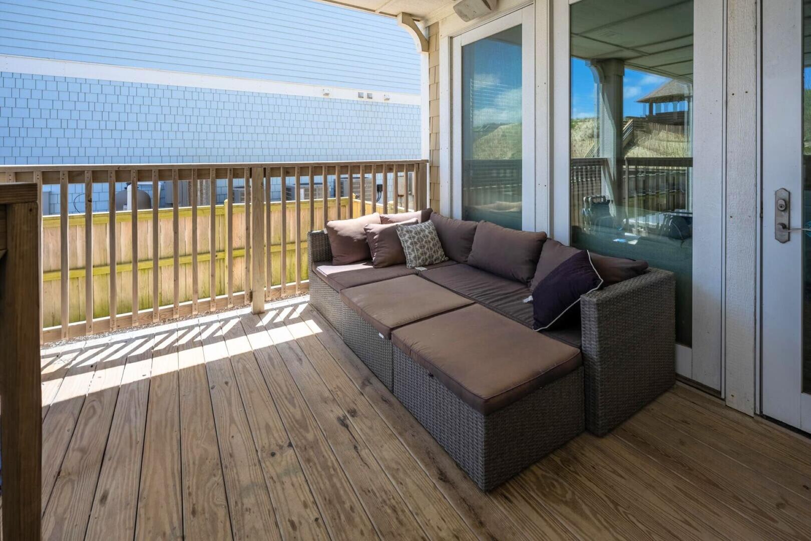 On the second level, you will find two additional King En Suites. One offers semi-ocean views with access to the deck, while the other provides ample space to unwind and includes a flat-screen TV. This level is also home to a good time, featuring a recreation room with a pool table and foosball table, a theater room with a kitchenette perfect for movie nights, and a covered patio where you can savor the fresh ocean breezes.