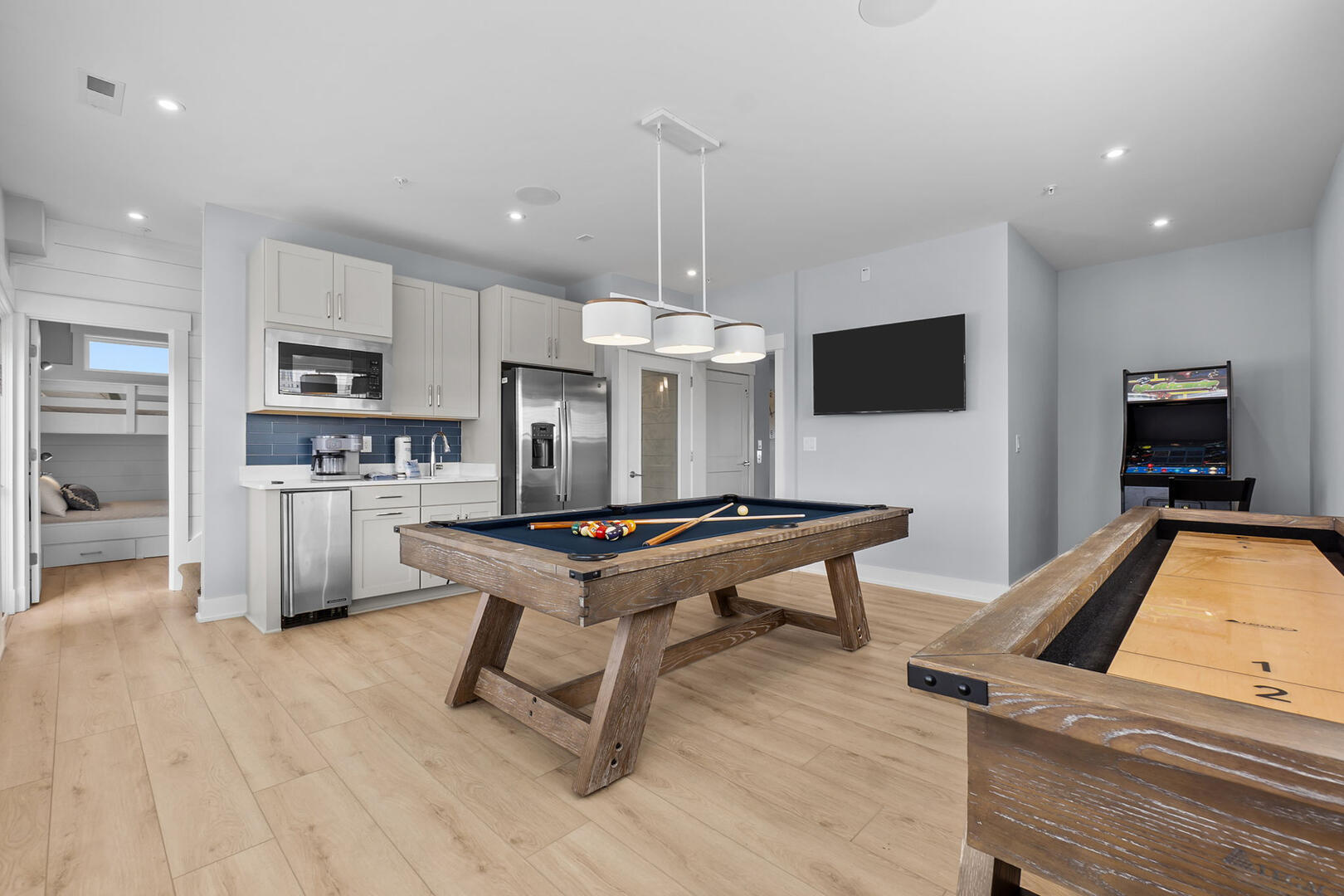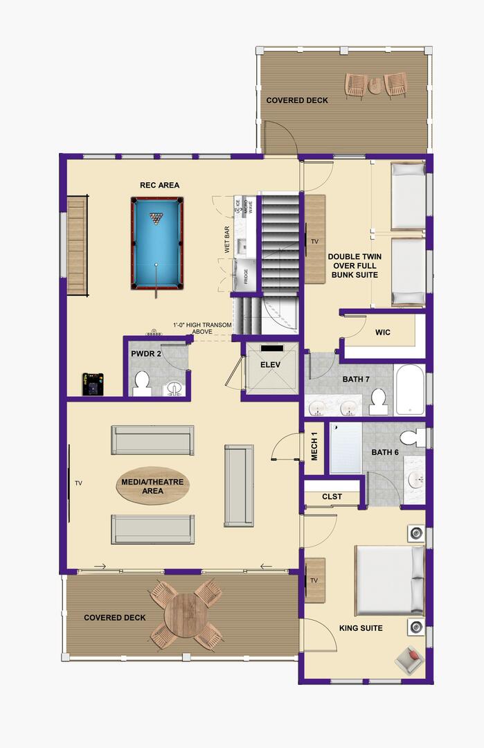 Indoor entertainment takes center stage on this level! Kids will love the bunk-style trundle En Suite, while adults can enjoy their private King En Suite with direct porch access. Spend hours in the fully equipped rec room playing arcade games, billiards, or shuffleboard. Catch a movie in the cozy media room or gather for a round of drinks at the wet bar. The elevator provides access to all upper levels.Read More About the Second Level
