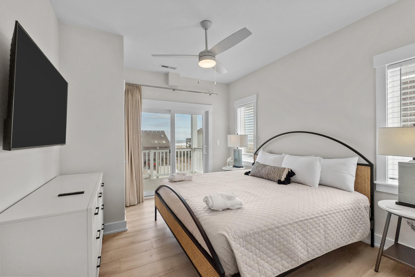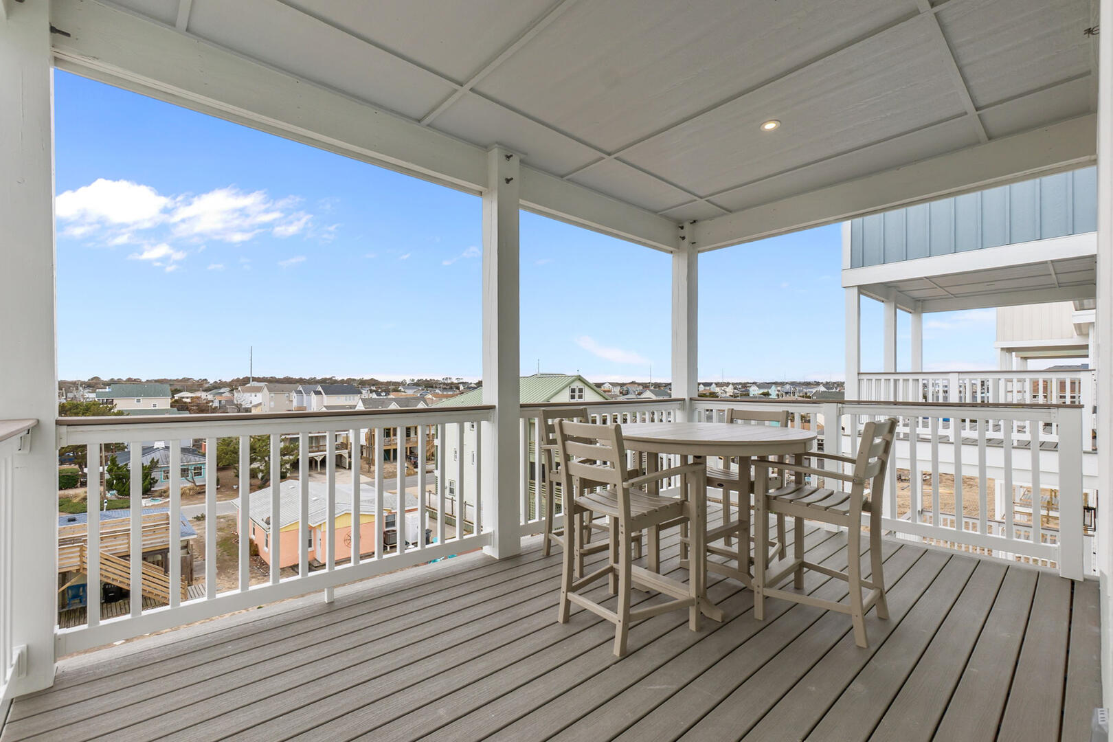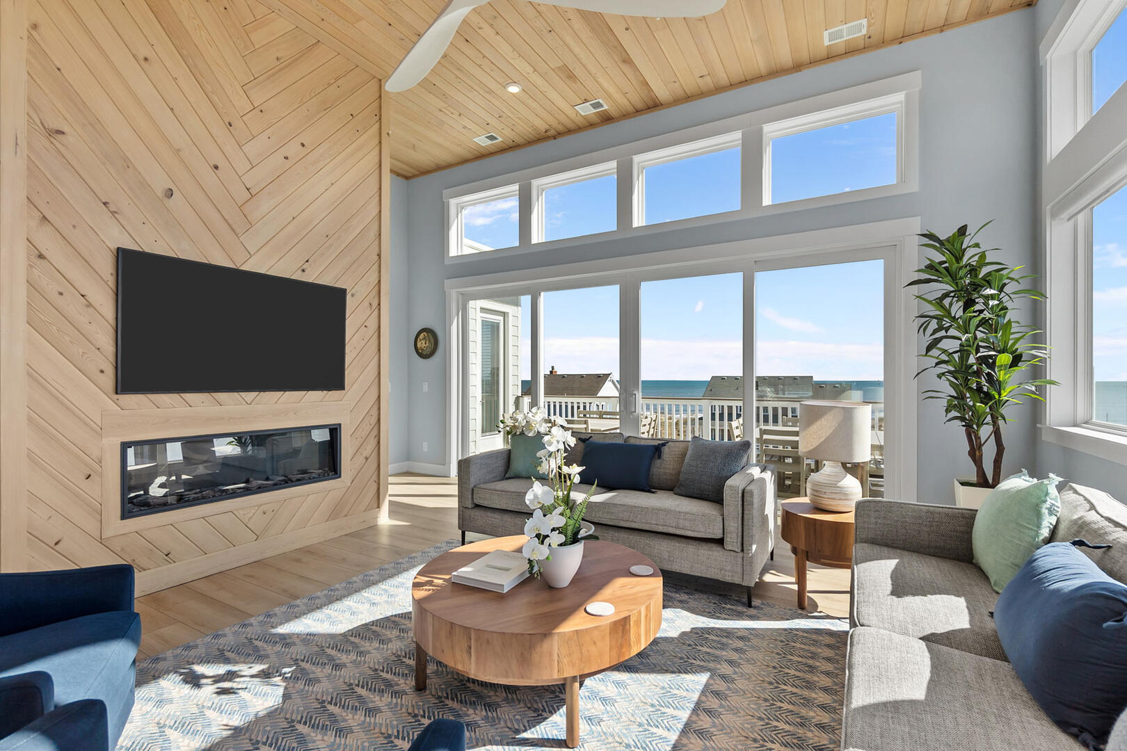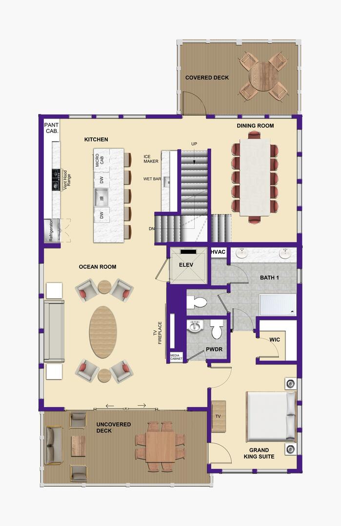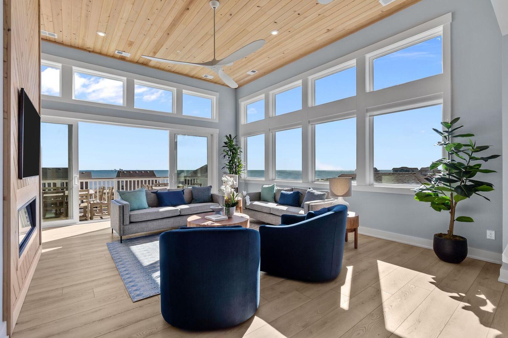 This is the heart of the home! Gather in the Ocean Room living area with cozy seating and an electric fireplace or prepare meals in the chef’s dream kitchen featuring double appliances and a convenient ice machine. Share stories around the 12-person dining table, with an additional 6 seats at the bar. The Grand King En Suite on this level offers privacy and elevated views. Step out onto the covered decks to sip morning coffee or enjoy an evening cocktail under the stars. A main uncovered deck, connected directly to the Ocean Room, features a square table with 8 chairs and a 2-cushioned couch, the perfect spot for open-air dining and relaxation.Read More About the Fourth Level
