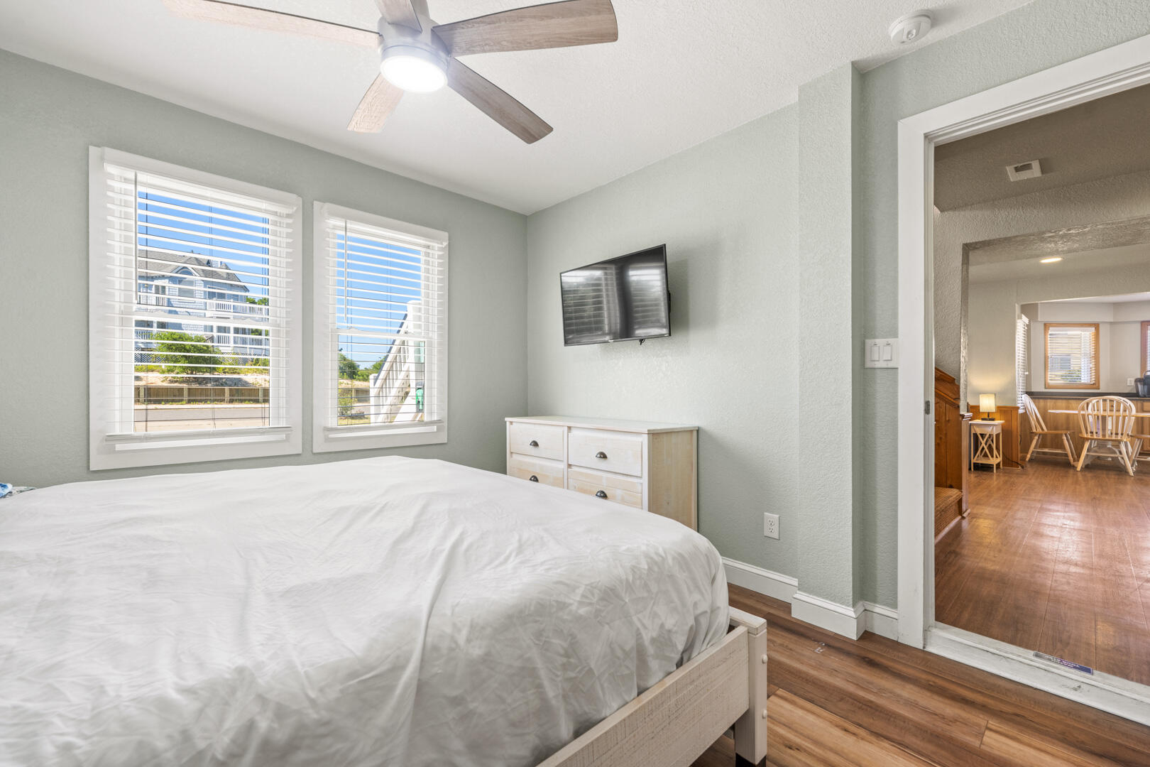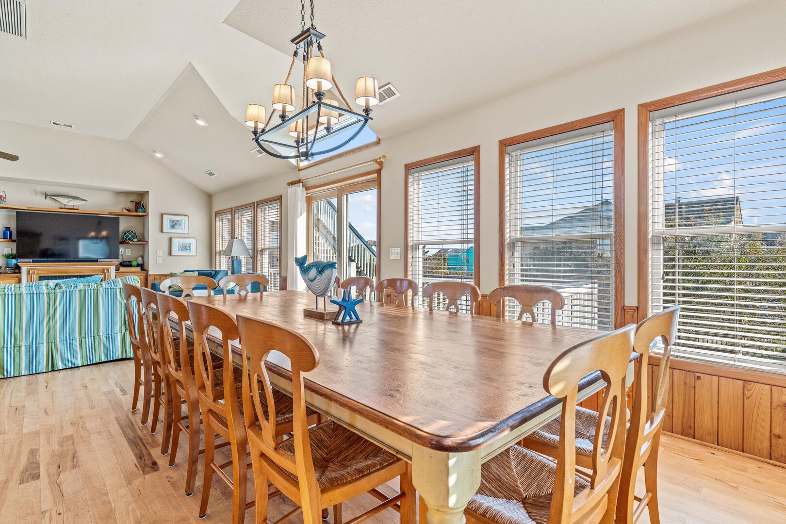 The third level is where your family and friends will gather. Lounge back on the BIG couch, turn on the flat-screen Smart TV and unwind. Bring your streaming service information to enjoy your favorite shows and movies on demand ​or watch live TV via the Spectrum TV app. This great room has it all! The living, dining, and kitchen area has plenty to boast about with two dishwashers, a reading nook, and ample space to put your belongings. The dining room table seats 14 comfortably with plenty of bar seating and an additional table for 6 - with a great view. When you're ready to step outside, there is direct deck access! No need to sneak back downstairs to use the restroom, this level has a half bathroom for your convenience.