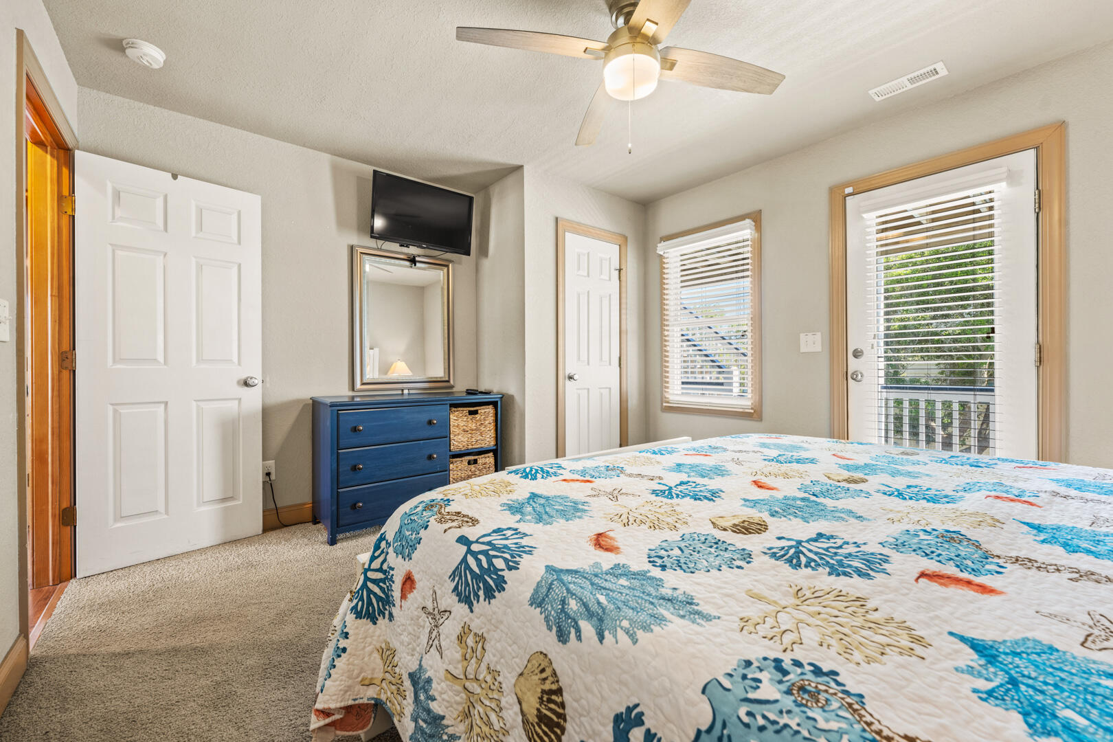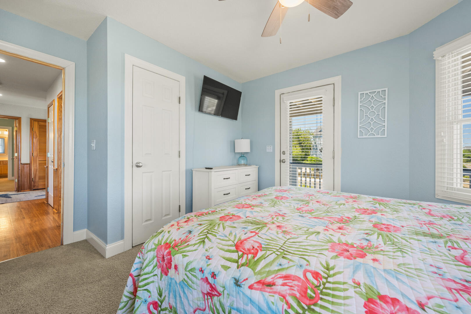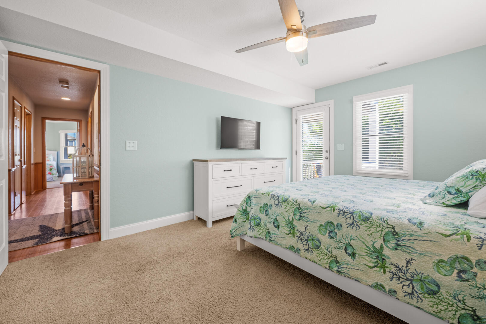 Leading up the stairs, you will find many of the home's bedrooms. Couples love the two King En Suites with accompanying TVs. There are also Queen and King bedrooms with deck access, and a bedroom with a Full over Queen Bunk Bed. Folks staying on this level will make use of the full bathroom in the hallway.