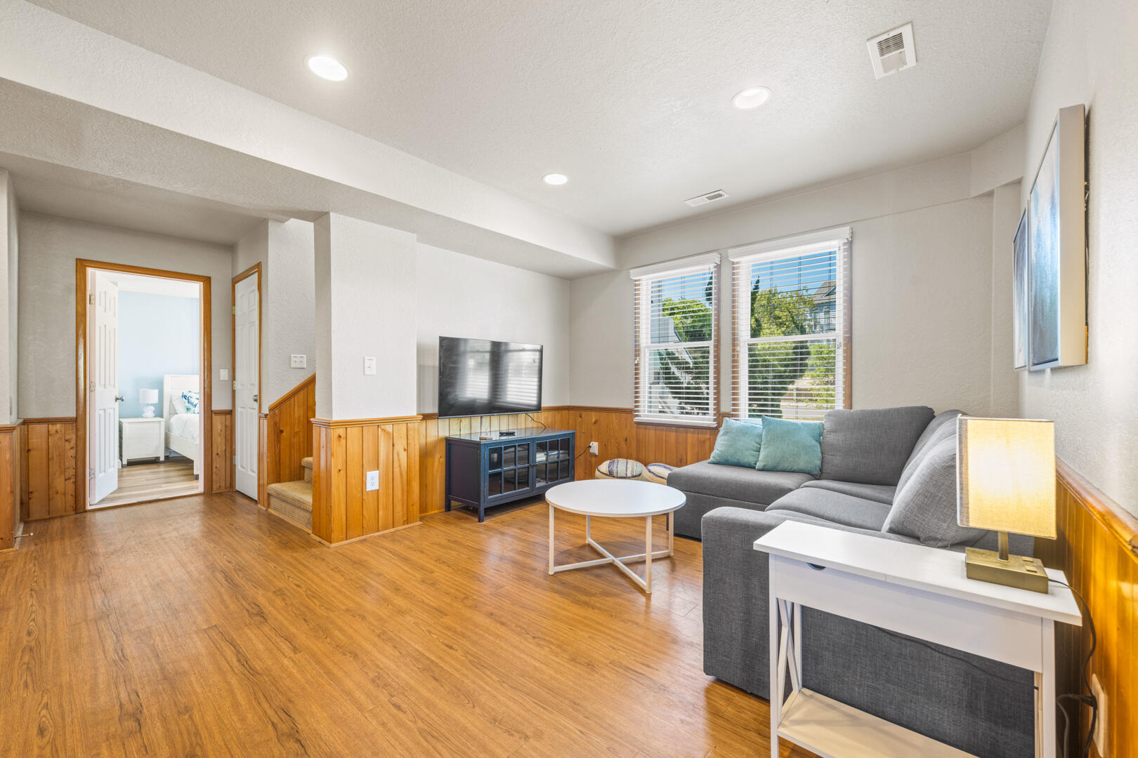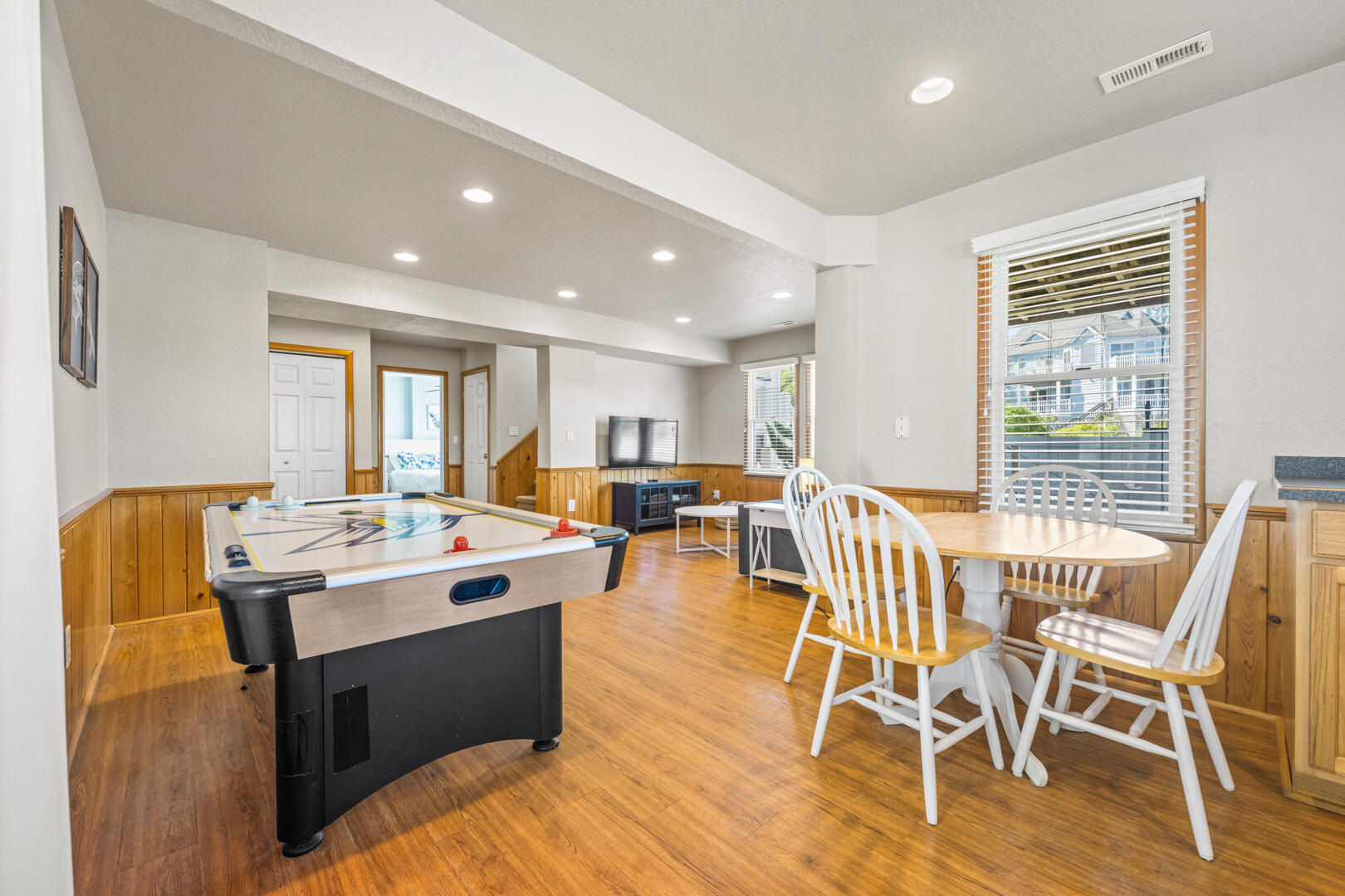 On the first level, you'll find many fun accommodations. Guests love our easy access to the pool area, rec-room with flat-screen TV for streaming movies and gaming, pub table for 2, and an air hockey table. Not to mention the kitchenette with under bar refrigerator for easy access and saving you a trip up the stairs. This level also features three bedrooms: a King En Suite, a Queen bedroom, and a bedroom with two pyramid bunks, all with a TV. In the hallway, you'll find a full bathroom and a washer and dryer.