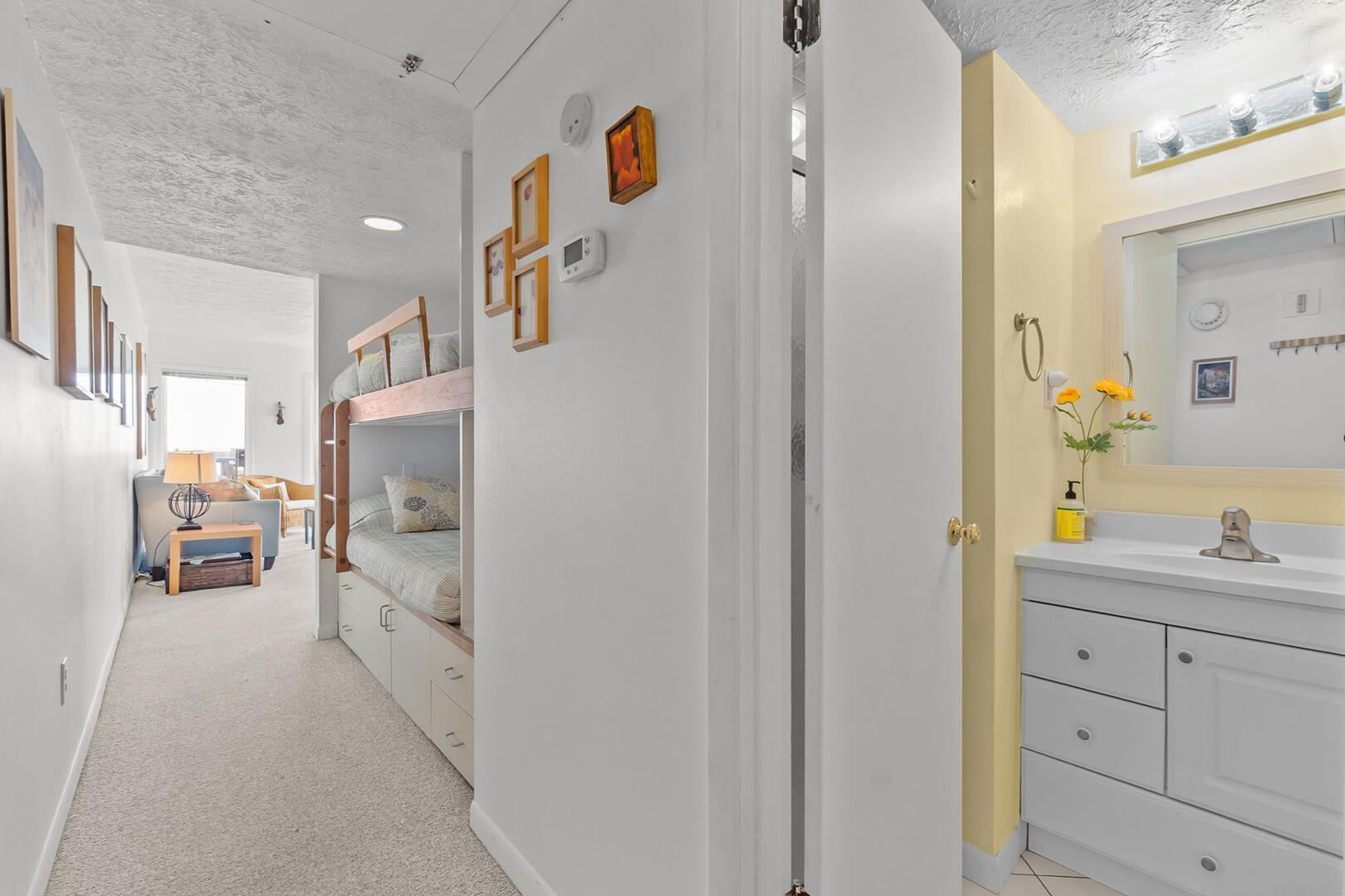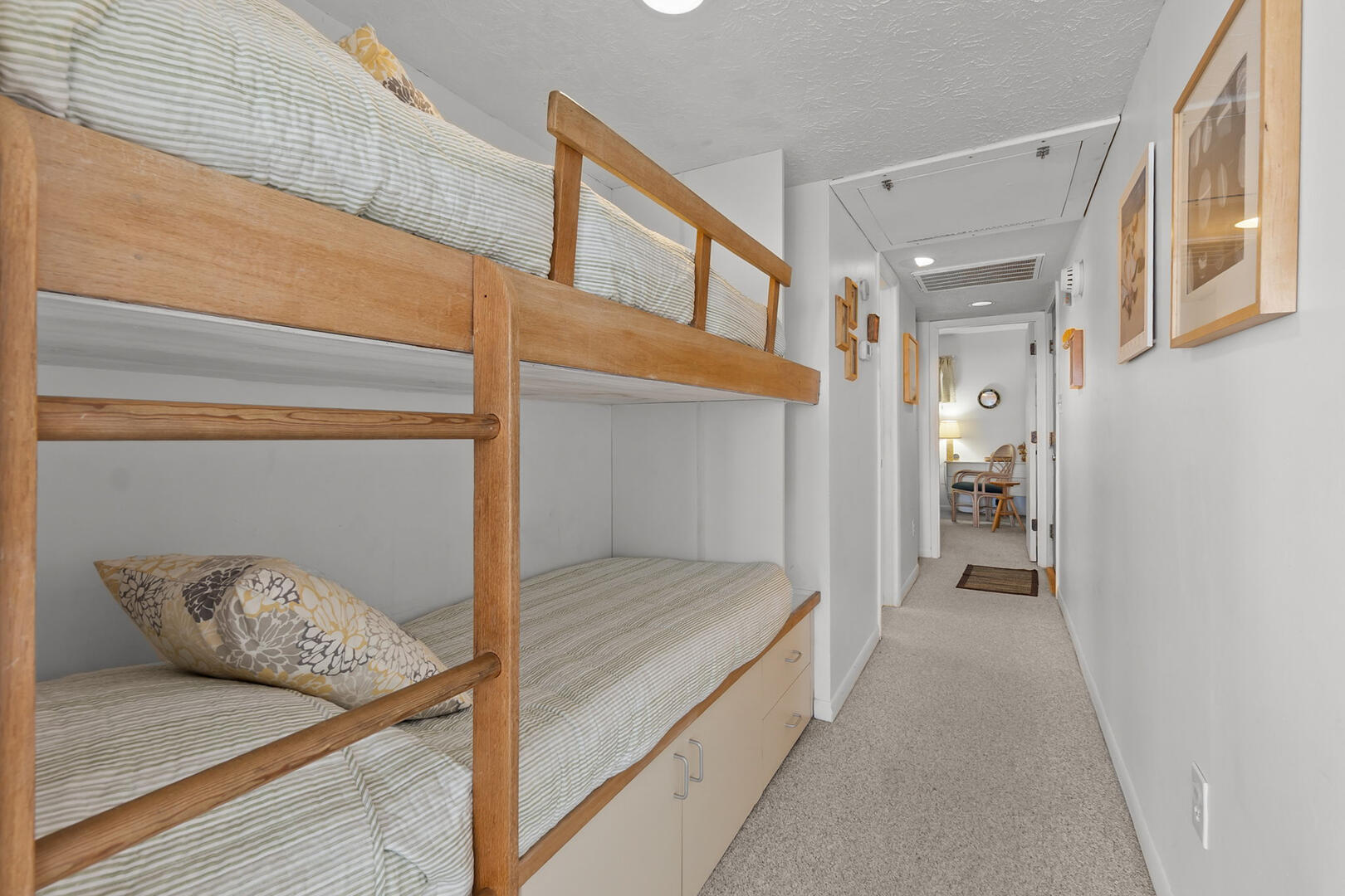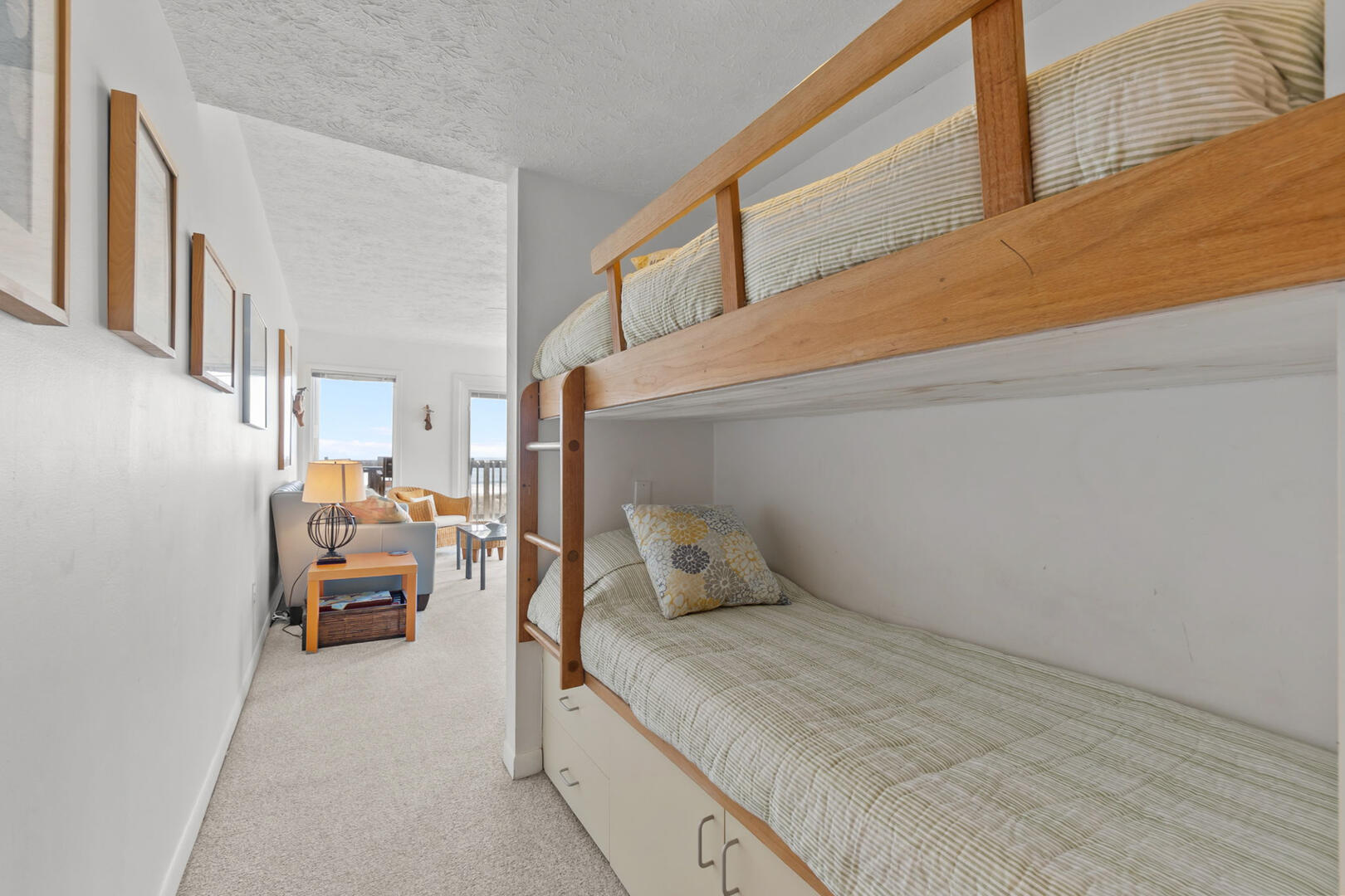 Sleeping accommodations include a Queen En Suite and a Twin over Twin alcove Bunk Set in the hallway, making this condo ideal for couples, small families, or groups. A second full bathroom is also located in the hall.