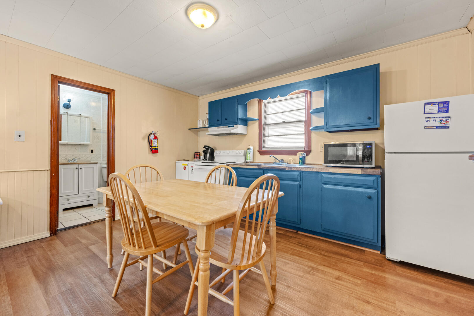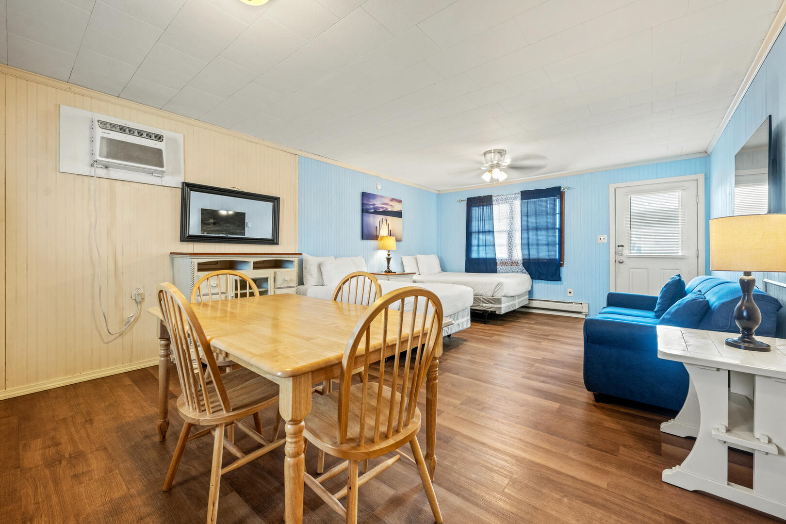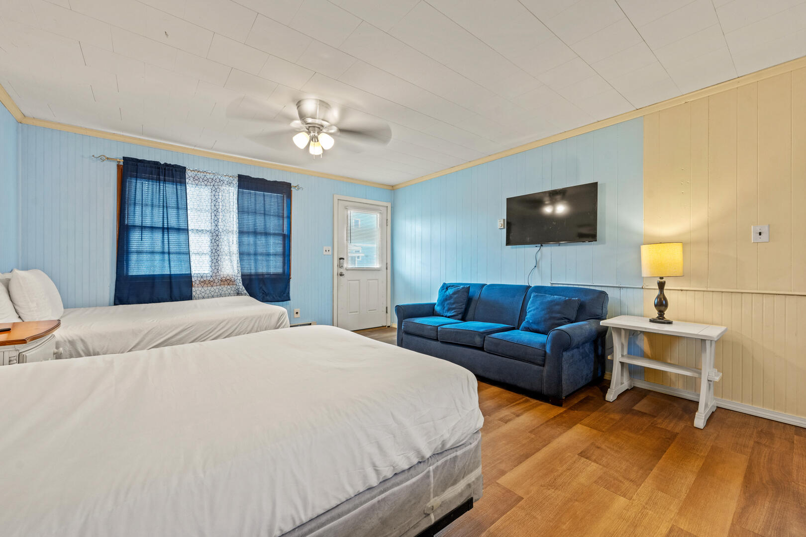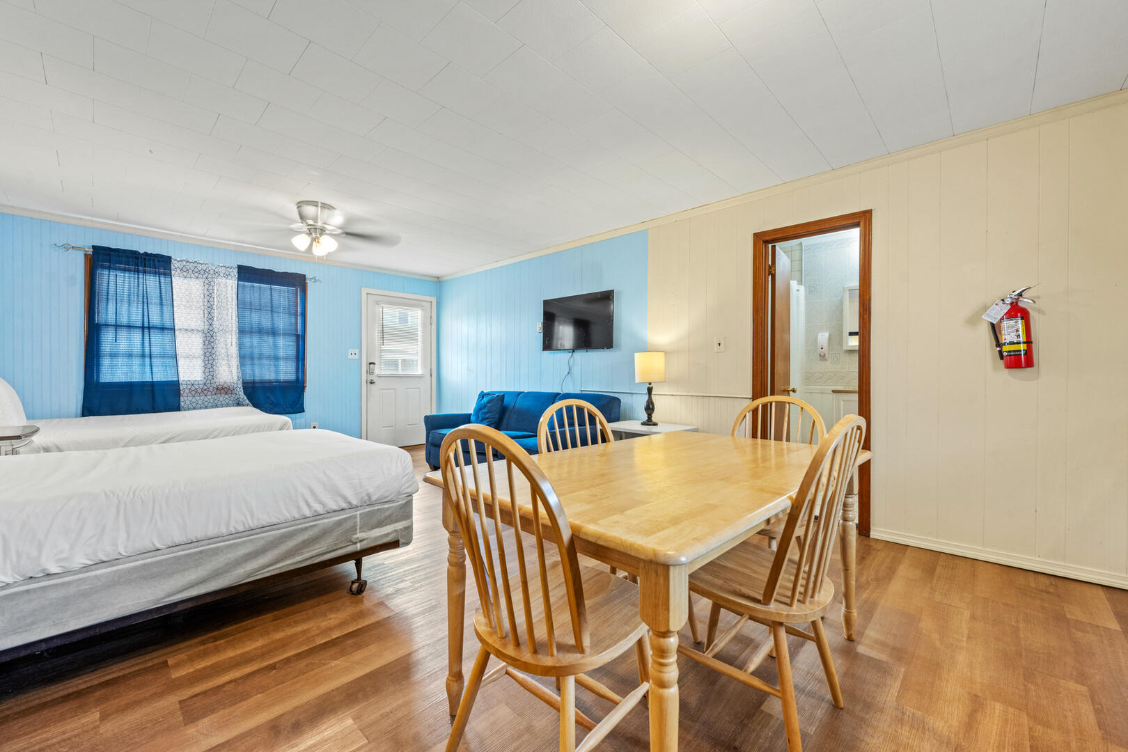Oceanside Court offers one-, two-, and three-bedroom stand-alone cottages as well as efficiency accommodations. The Deckmate’s Efficiency 11 is a wide-open living space with a couch and 2 full beds. Enjoy time on the front porch with bench seating as you smell the Atlantic Ocean and feel the warm breeze on your skin. This cottage includes a full kitchen with a microwave and coffee maker, a dining room table, and a full bathroom. All guests can enjoy their favorite shows on the TV.