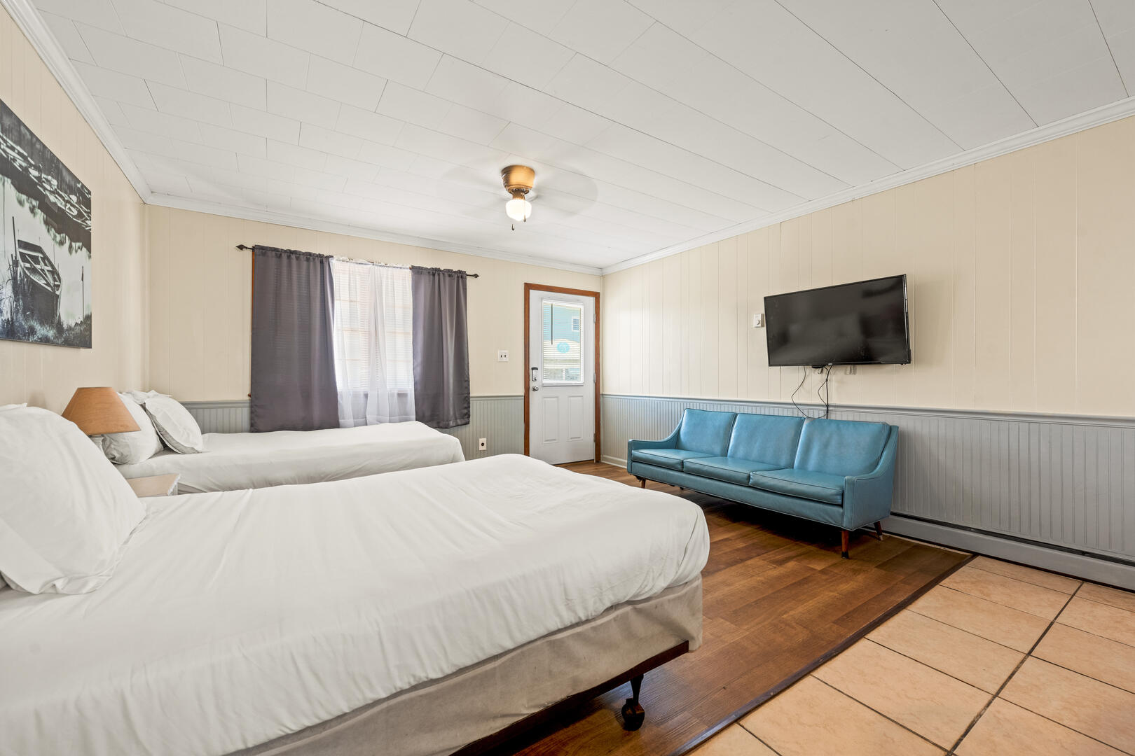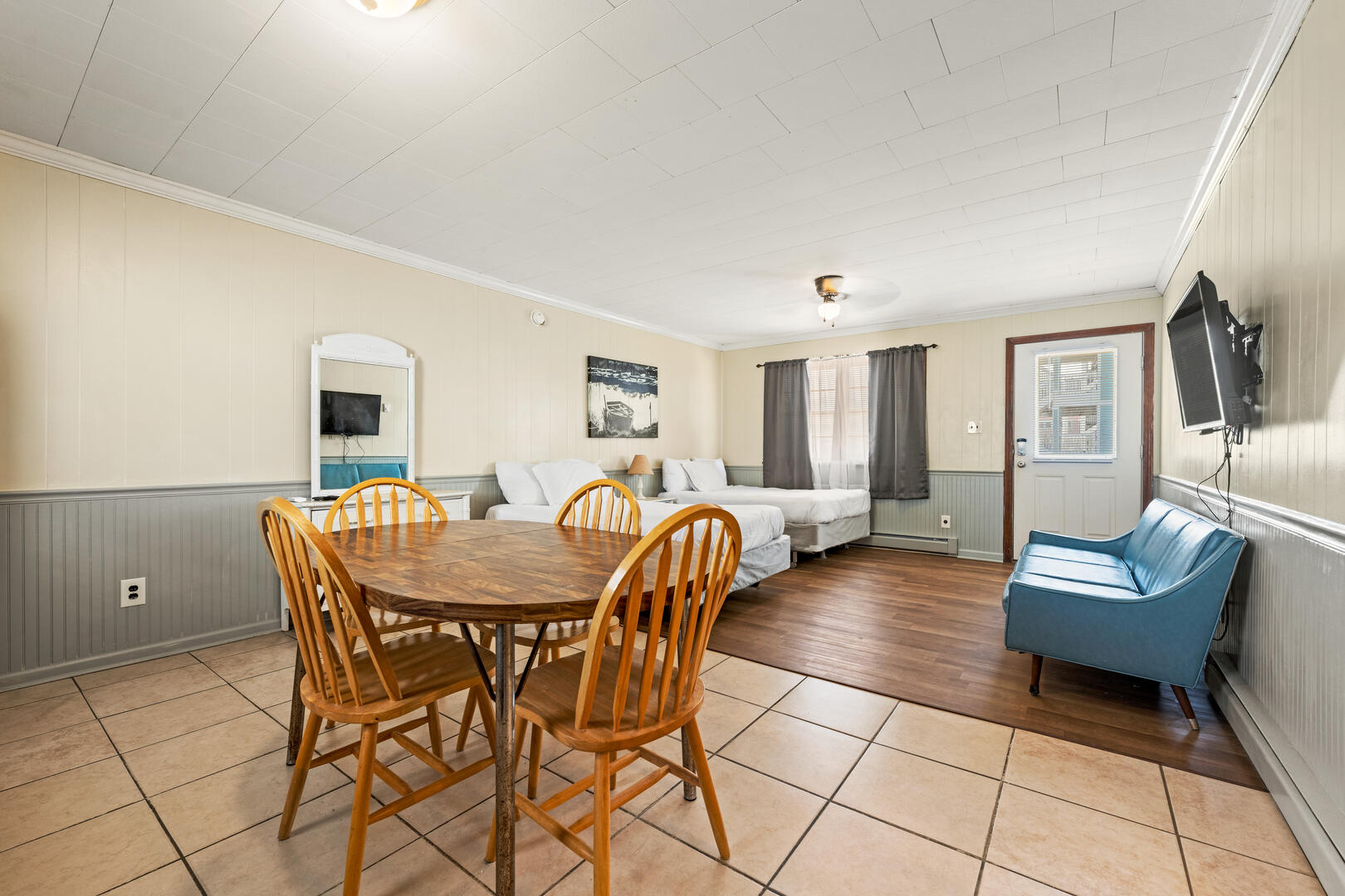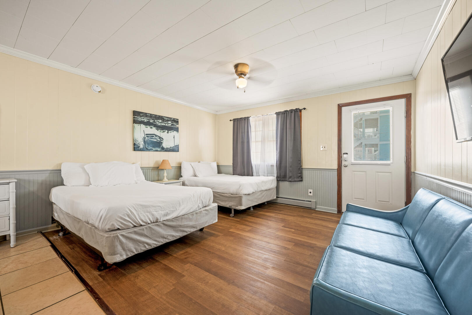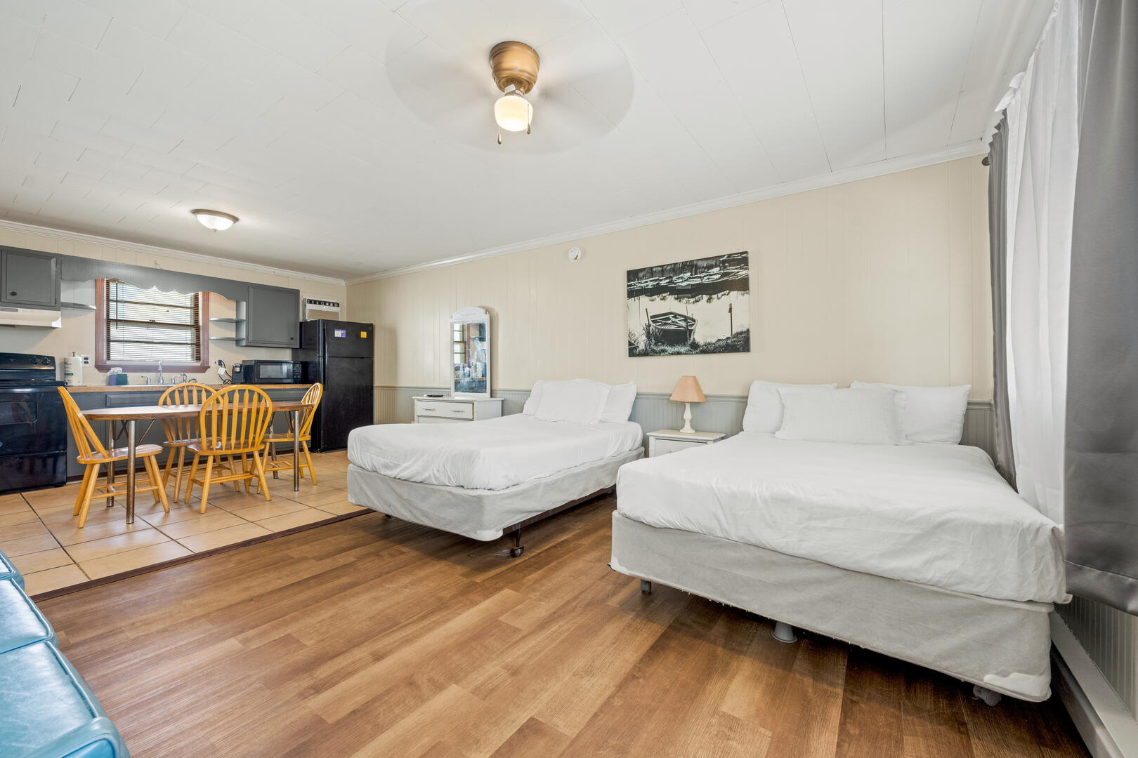 Oceanside Court offers one-, two-, and three-bedroom stand-alone cottages as well as efficiency accommodations. The Sailor's Efficiency 9 is a wide-open living space with a couch and 2 full beds. Enjoy time on the front porch with bench seating as you smell the Atlantic Ocean and feel the warm breeze on your skin. This cottage includes a full kitchen with a microwave and coffee maker, a dining room table, and a full bathroom. All guests can enjoy their favorite shows on the TV.