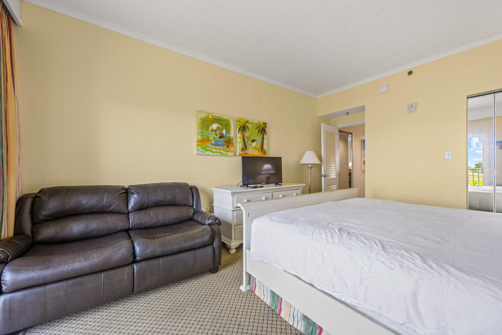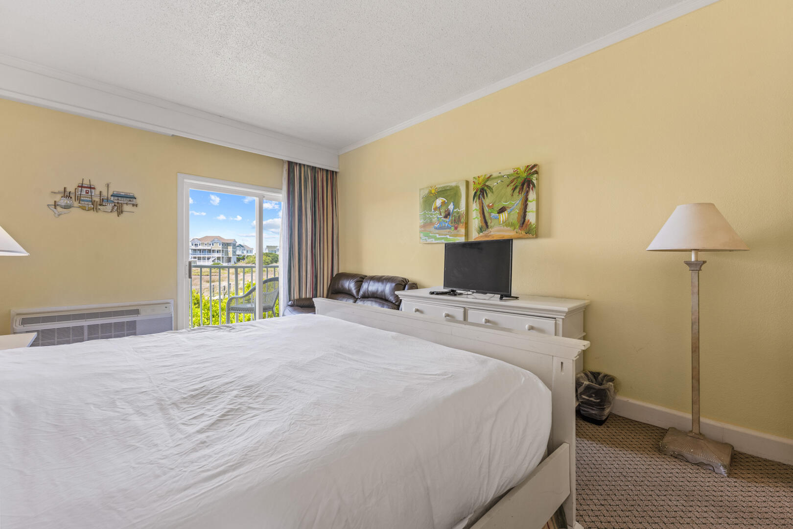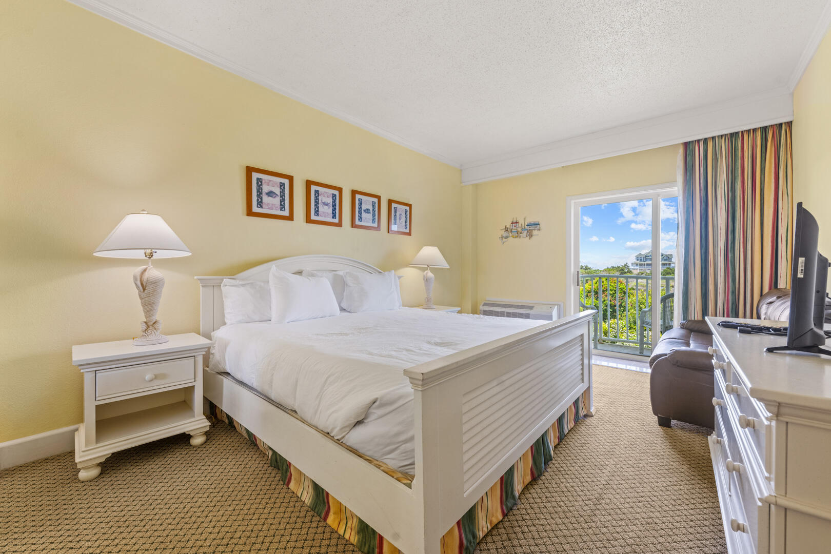 With a king bed and queen-sized sleeper sofa, this cozy little one-bedroom condo can accommodate up to four guests with ease. Throughout the interior, pictures of sea-life have been hung to remind vacationers of the nautical history that is prolific throughout the OBX and particularly prevalent in Hatteras. Flat screen TVs adorn both the living room and bedroom to allow for comfy relaxation after a great day at the beach!