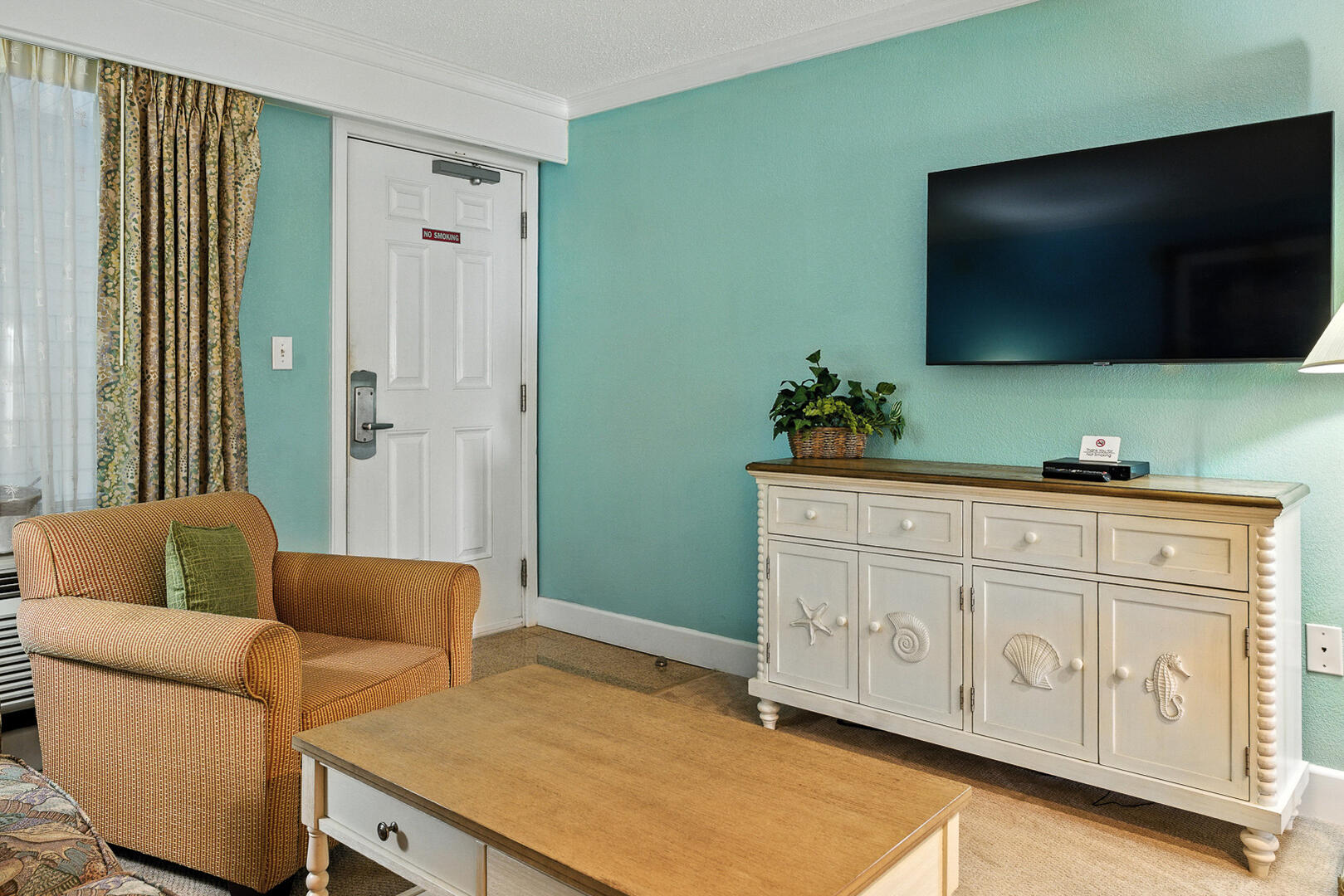 With a king bed and queen-sized sleeper sofa, this cozy little one-bedroom condo can accommodate up to four guests with ease. Throughout the interior, pictures of sea-life have been hung to remind vacationers of the nautical history that is prolific throughout the OBX and particularly prevalent in Hatteras. Flat screen TVs adorn both the living room and bedroom to allow for comfy relaxation after a great day at the beach!
