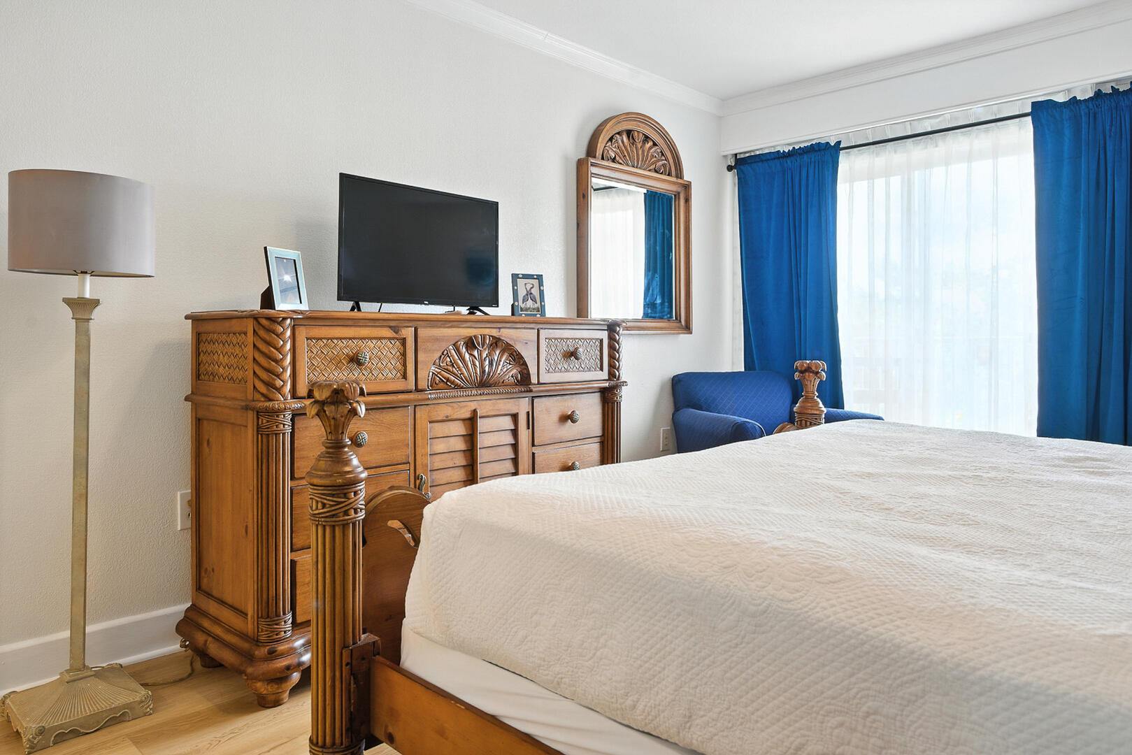 With a King bed and Queen-sized sleeper sofa, this cozy little one-bedroom condo can accommodate up to four guests with ease. Throughout the interior, pictures of sea-life have been hung to remind vacationers of the nautical history that is prolific throughout the OBX and particularly prevalent in Hatteras. Flat screen TVs adorn both the living room and bedroom to allow for comfy relaxation after a great day at the beach!